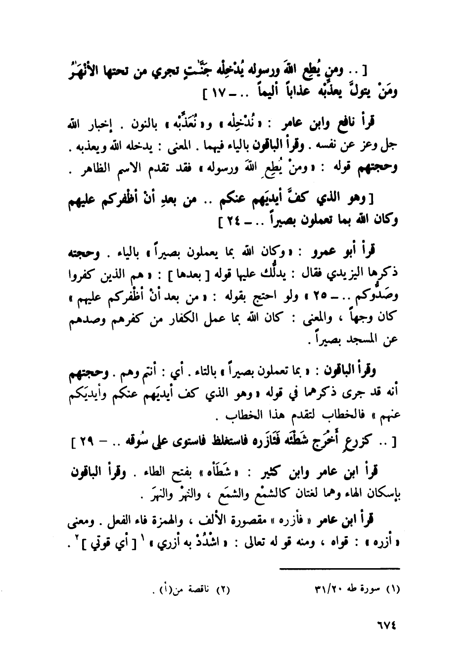 قَرَأَ نَافِع وَابْن عَامر / ندخله / و {نعذبه} بالنُّون إِخْبَار الله جلّ وَعز عَن نَفسه وَقَرَأَ الْبَاقُونَ بِالْيَاءِ فيهمَا الْمَعْنى يدْخلهُ الله ويعذبه وحجتهم قَوْله {وَمن يطع الله وَرَسُوله} فقد تقدم الِاسْم الظَّاهِر