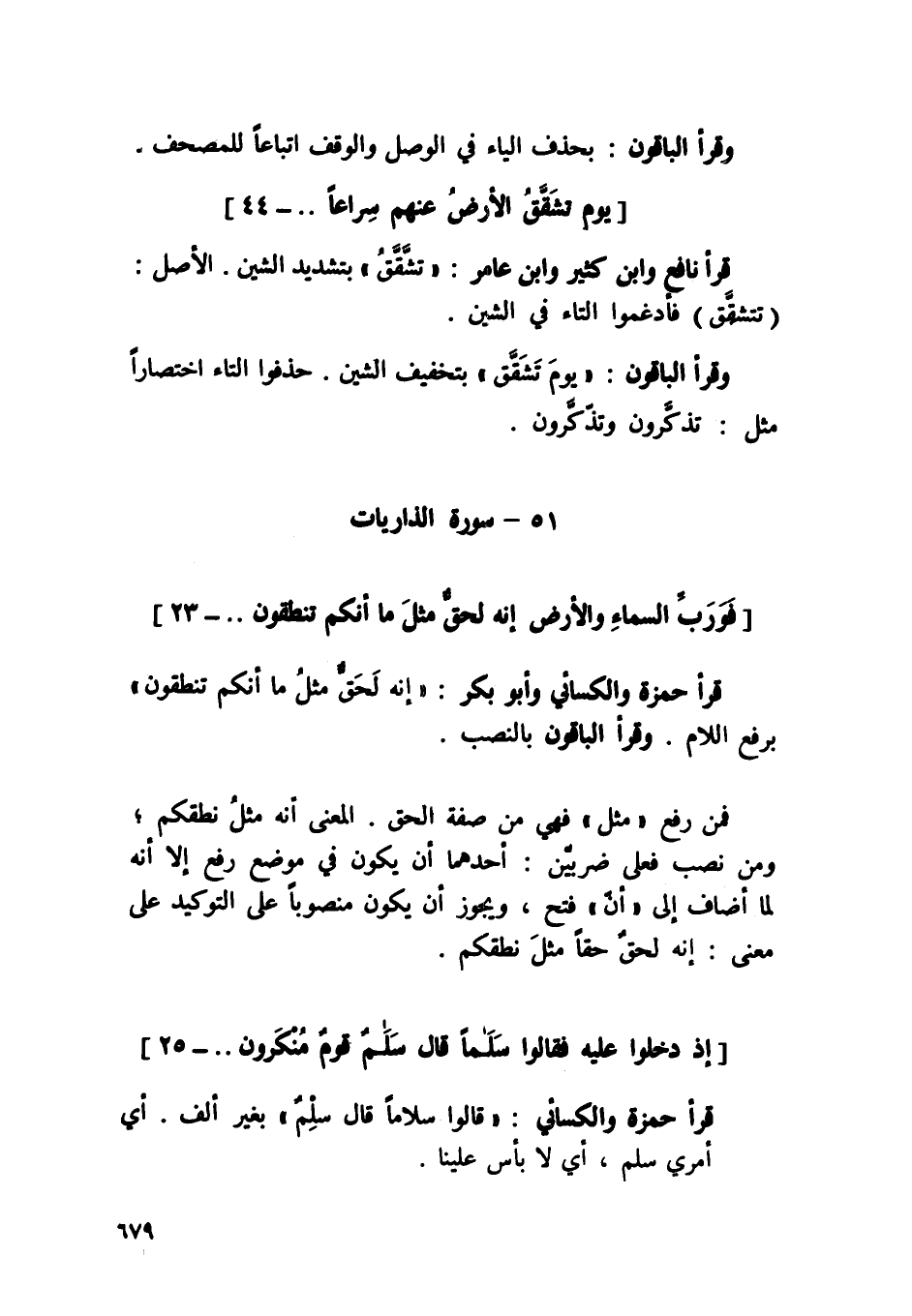 قَرَأَ حَمْزَة وَالْكسَائِيّ وابو بكر {إِنَّه لحق مثل مَا أَنكُمْ تنطقون} بِرَفْع اللَّام وَقَرَأَ الْبَاقُونَ بِالنّصب