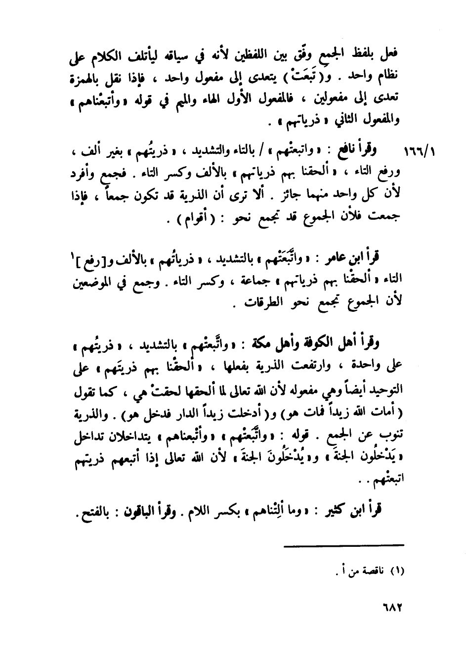 وَقَرَأَ نَافِع {وَاتَّبَعتهمْ} بِالتَّاءِ وَالتَّشْدِيد ذُرِّيتهمْ بِغَيْر ألف وَرفع التَّاء / ألحقنا بهم ذرياتهم / بِالْألف وَكسر التَّاء فَجمع وأفرد لِأَن كل وَاحِد مِنْهُمَا جَائِز أَلا ترى أَن الذُّرِّيَّة قد تكون جمعا فَإِذا جمعت فَلِأَن الجموع قد تجمع نَحْو أَقوام