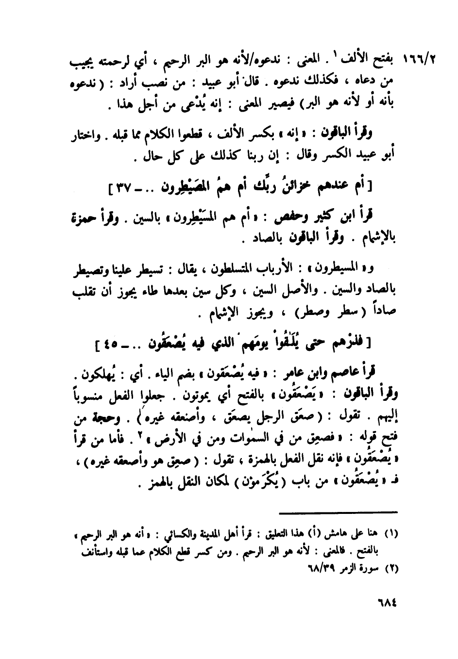 قَرَأَ ابْن كثير وَحَفْص / أم هم المسيطرون / بِالسِّين وَقَرَأَ حَمْزَة بالإشمام وَقَرَأَ الْبَاقُونَ بالصَّاد