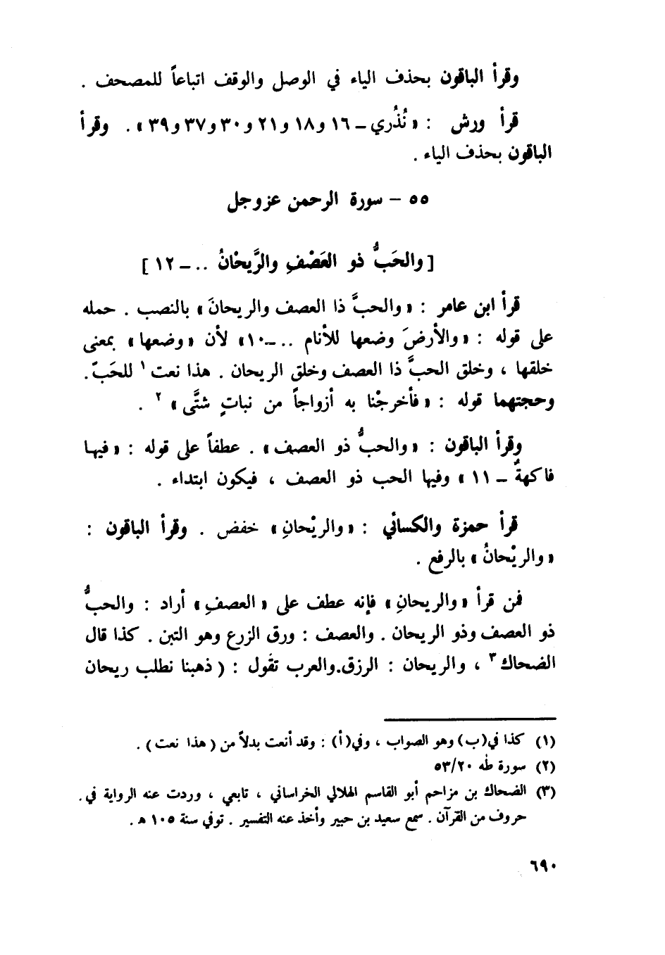 فَمن قَرَأَ {وَالريحَان} فَإِنَّهُ عطف على {العصف} أَرَادَ وَالْحب ذُو العصف وَذُو الريحان والعصف ورق الزَّرْع وَهُوَ التِّبْن كَذَا قَالَ الضَّحَّاك وَالريحَان الرزق وَالْعرب تَقول ذَهَبْنَا نطلب ريحَان