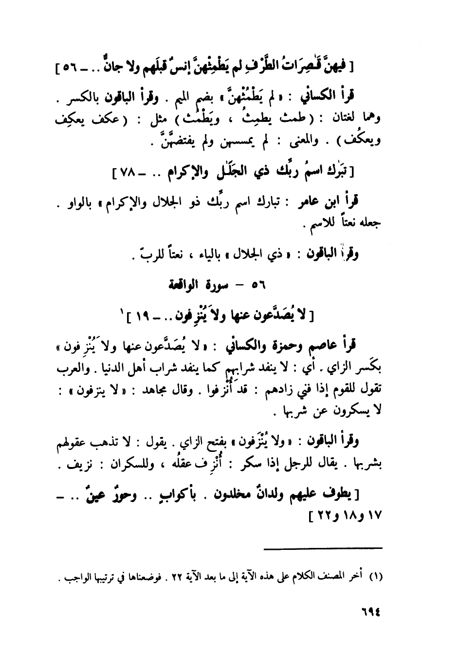 قَرَأَ عَاصِم وَحَمْزَة وَالْكسَائِيّ {لَا يصدعون عَنْهَا وَلَا ينزفون} بِكَسْر الزَّاي أَي لَا ينْفد شرابهم كَمَا ينْفد شراب أهل الدُّنْيَا وَالْعرب تَقول للْقَوْم إِذا فني زادهم قد أنزفوا وَقَالَ مُجَاهِد {وَلَا ينزفون} لَا يسكرون عَن شربهَا