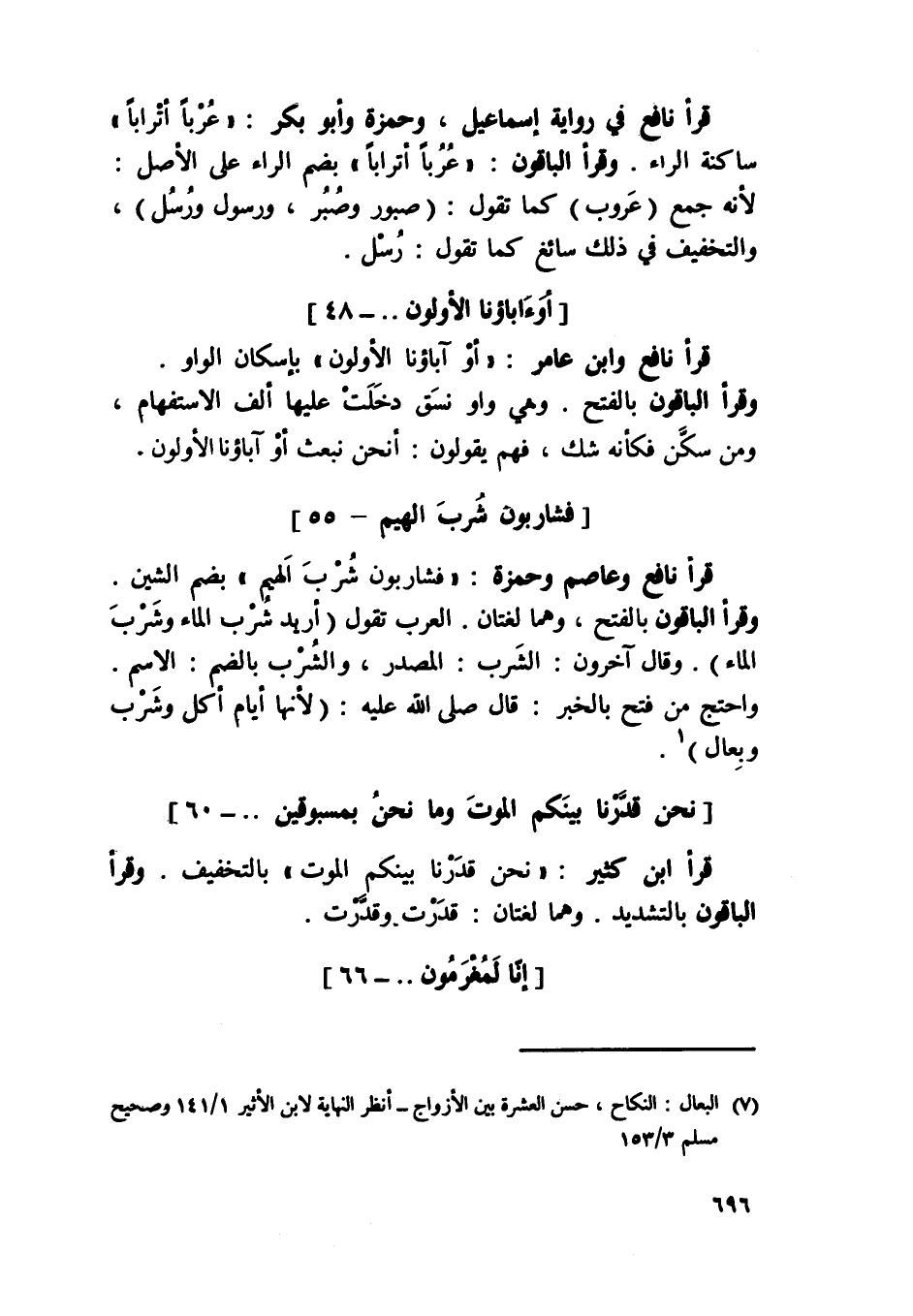 قَرَأَ نَافِع وَابْن عَامر / أَو آبَاؤُنَا الْأَولونَ / بِإِسْكَان الْوَاو وَقَرَأَ الْبَاقُونَ بِالْفَتْح وَهِي وَاو نسق دخلت عَلَيْهَا ألف الِاسْتِفْهَام وَمن سكن فَكَأَنَّهُ شكّ فهم يَقُولُونَ أَنَحْنُ نبعث أَو آبَاؤُنَا الْأَولونَ