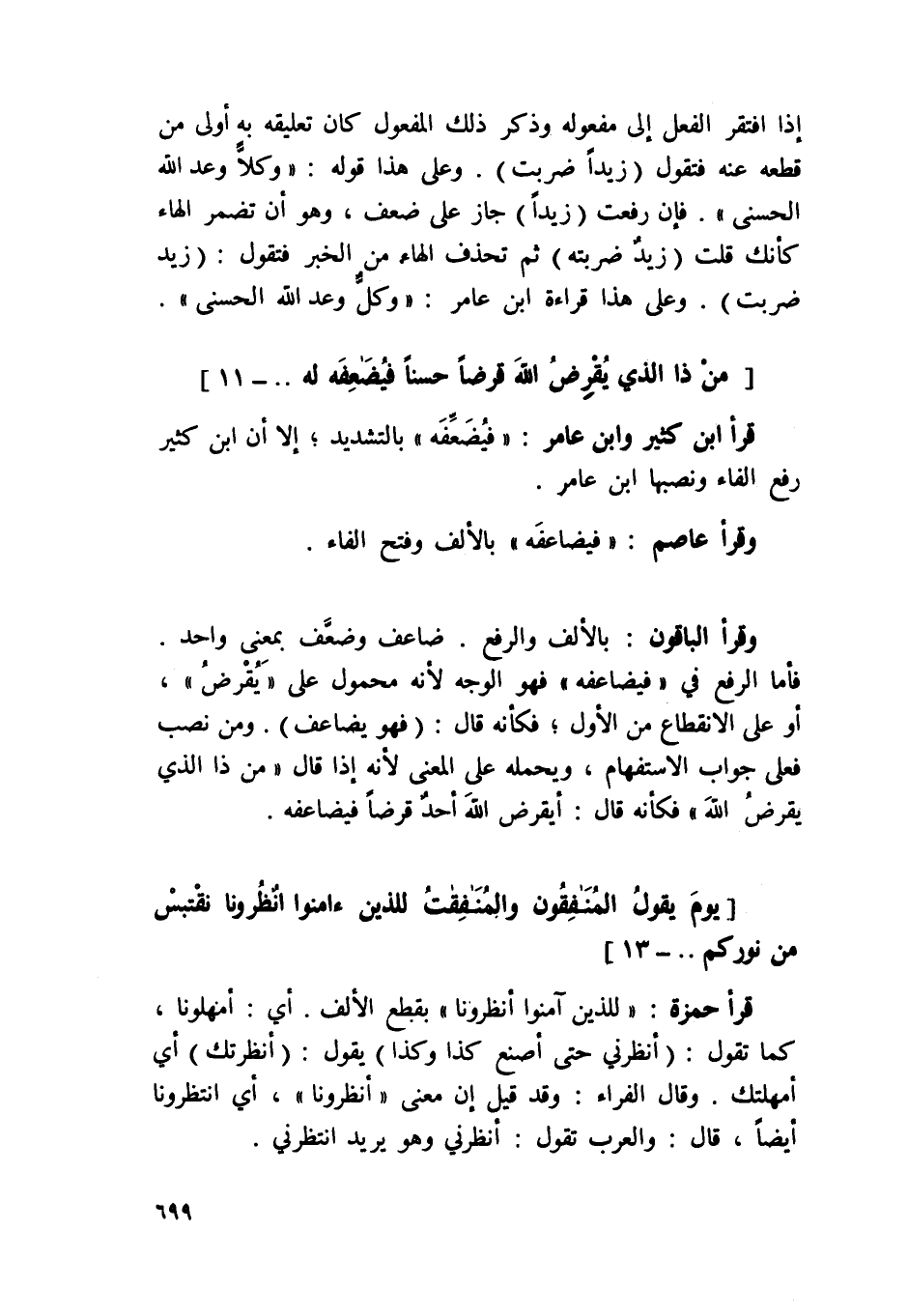 قَرَأَ ابْن كثير وَابْن عَامر / فيضعفه / بِالتَّشْدِيدِ إِلَّا أَن ابْن كثير رفع الْفَاء ونصبها ابْن عَامر