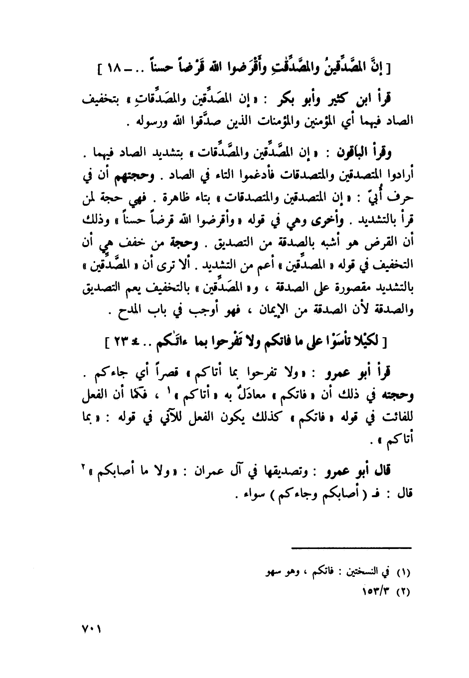 وَقَرَأَ الْبَاقُونَ {إِن المصدقين والمصدقات} بتَشْديد الصَّاد فيهمَا أَرَادوا المتصدقين والمتصدقات فأدغموا التَّاء فِي الصَّاد وحجتهم أَن فِي حرف أبي / إِن المتصدقين والمتصدقات / بتاء ظَاهِرَة فَهِيَ حجَّة لمن قَرَأَ بِالتَّشْدِيدِ وَأُخْرَى وَهِي فِي قَوْله {وأقرضوا الله قرضا حسنا} وَذَلِكَ أَن الْقَرْض هُوَ أشبه بِالصَّدَقَةِ من التَّصْدِيق وَحجَّة من خفف هِيَ أَن التَّخْفِيف فِي قَوْله {المصدقين} أَعم من التَّشْدِيد أَلا ترى أَن المصدقين بِالتَّشْدِيدِ مَقْصُورَة على الصَّدَقَة والمصدقين بِالتَّخْفِيفِ يعم التَّصْدِيق وَالصَّدَََقَة لِأَن الصَّدَقَة من الْإِيمَان فَهُوَ أوجب فِي بَاب الْمَدْح {لكَي لَا تأسوا على مَا فاتكم وَلَا تفرحوا بِمَا آتَاكُم} 23