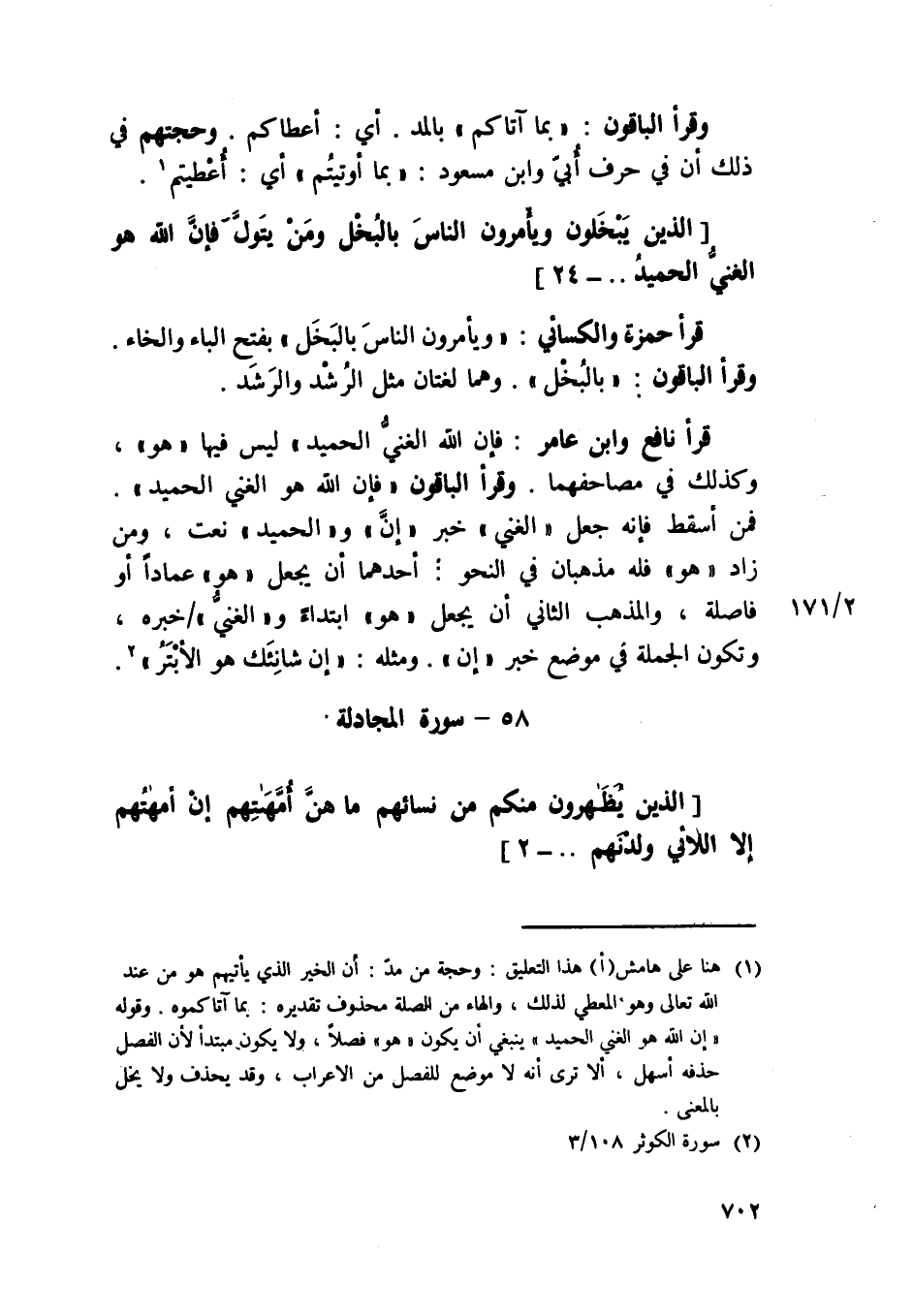 قَرَأَ نَافِع وَابْن عَامر / فَإِن الله الْغَنِيّ الحميد / لَيْسَ فِيهَا هُوَ وَكَذَلِكَ فِي مصاحفهما وَقَرَأَ الْبَاقُونَ {فَإِن الله هُوَ الْغَنِيّ الحميد} فَمن أسقط فَإِنَّهُ جعل {الْغَنِيّ} خبر {إِن} و {الحميد} نعت وَمن زَاد {هُوَ} فَلهُ مذهبان فِي النَّحْو أَحدهمَا أَن يَجْعَل هُوَ عمادا أَو فاصلة وَالْمذهب الثَّانِي أَن يَجْعَل هُوَ ابْتِدَاء والغني خَبره وَتَكون الْجُمْلَة فِي مَوضِع خبر إِن وَمثله {إِن شانئك هُوَ الأبتر}
