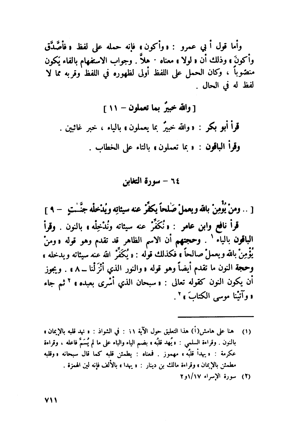 قَرَأَ نَافِع وَابْن عَامر / نكفر عَنهُ سيئاته وندخله / بالنُّون وَقَرَأَ الْبَاقُونَ بِالْيَاءِ وحجتهم أَن الِاسْم الظَّاهِر قد تقدم وَهُوَ قَوْله {وَمن يُؤمن بِاللَّه وَيعْمل صَالحا} فَكَذَلِك قَوْله {يكفر عَنهُ سيئاته ويدخله جنَّات} وَحجَّة النُّون مَا تقدم أَيْضا وَهُوَ قَوْله {والنور الَّذِي أنزلنَا} وَيجوز أَن يكون النُّون كَقَوْلِه تَعَالَى {سُبْحَانَ الَّذِي أسرى بِعَبْدِهِ} ثمَّ جَاءَ {وآتينا مُوسَى الْكتاب}