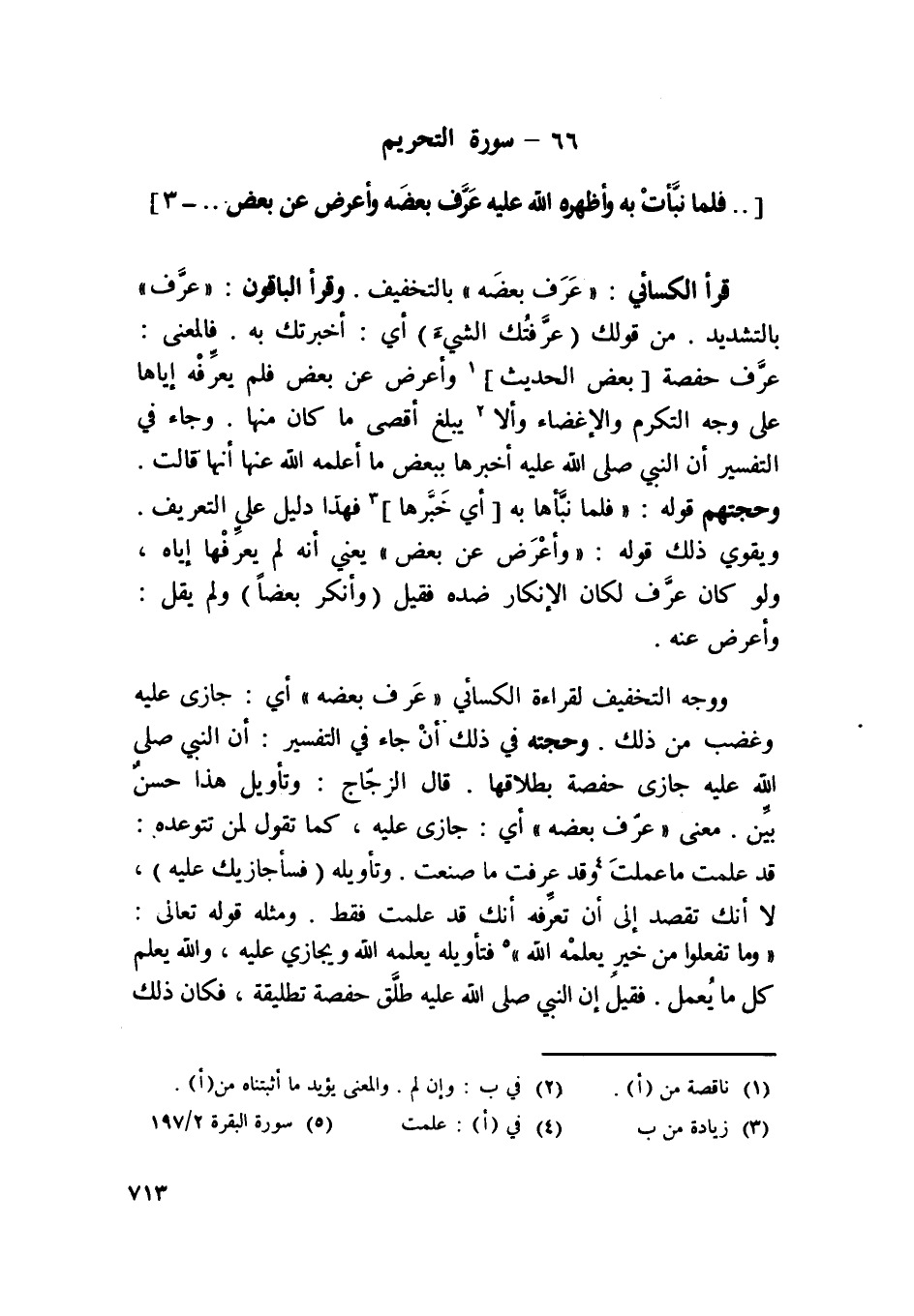 وَوجه التَّخْفِيف لقِرَاءَة الْكسَائي {عرف بعضه} أَي جازى عَلَيْهِ وَغَضب من ذَلِك وحجته فِي ذَلِك أَن جَاءَ فِي التَّفْسِير أَن النَّبِي صلى الله عَلَيْهِ جازى حَفْصَة بِطَلَاقِهَا قَالَ الزّجاج وَتَأْويل هَذَا حسن بَين معنى عرف بعضه أَي جازى عَلَيْهِ كَمَا تَقول لمن تتوعده قد علمت مَا عملت وَقد عرفت مَا صنعت تَأْوِيله فسأجازيك عَلَيْهِ لَا أَنَّك تقصد إِلَى أَن تعرفه أَنَّك قد علمت فَقَط وَمثله قَوْله تَعَالَى {وَمَا تَفعلُوا من خير يُعلمهُ الله} فتأويله يُعلمهُ الله ويجازي عَلَيْهِ وَالله يعلم كل مَا يعْمل فَقيل إِن النَّبِي صلى الله عَلَيْهِ طلق حَفْصَة تَطْلِيقَة فَكَانَ ذَلِك