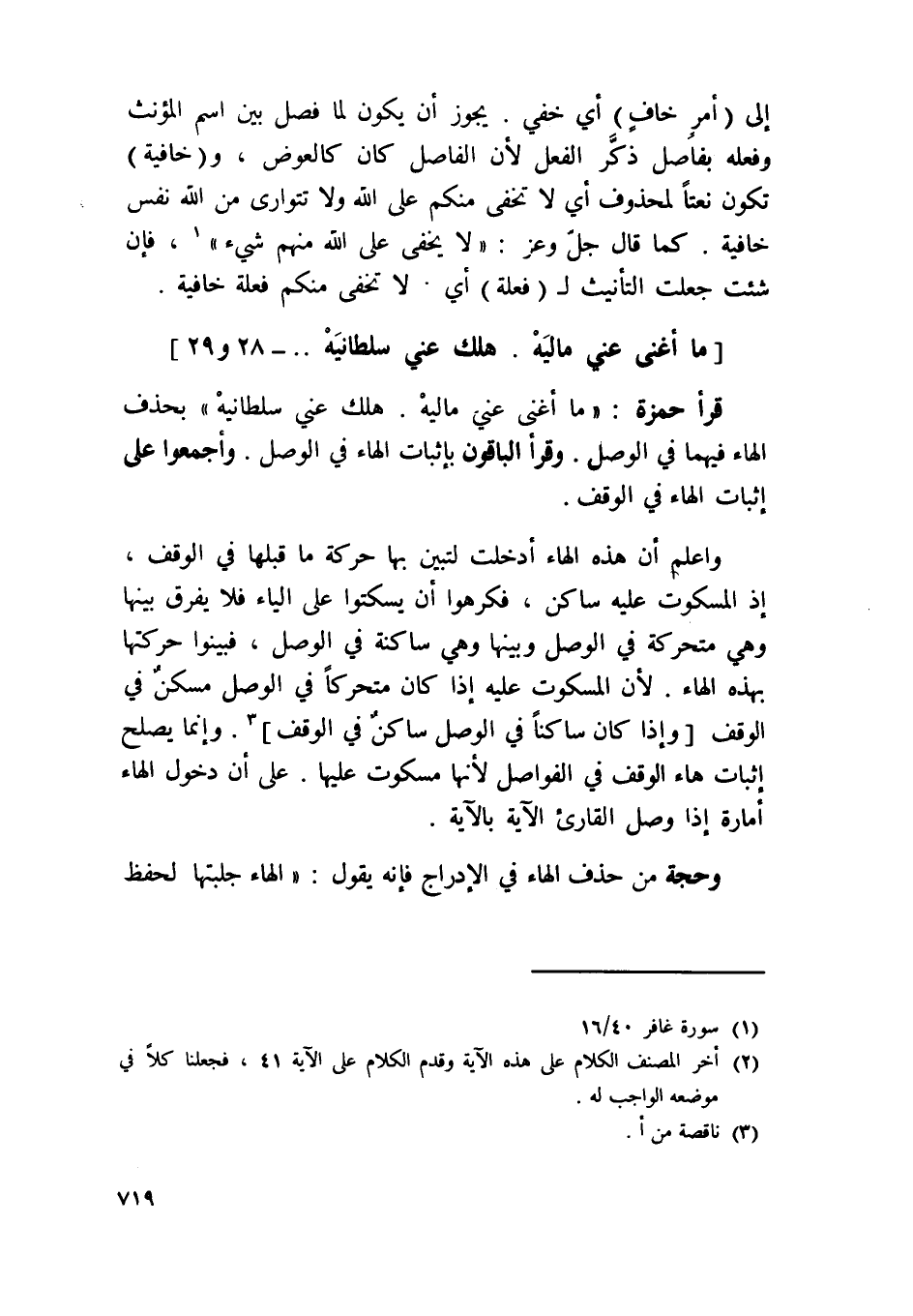 قَرَأَ حَمْزَة {مَا أغْنى عني ماليه هلك عني سلطانيه} بِحَذْف الْهَاء فيهمَا فِي الْوَصْل وَقَرَأَ الْبَاقُونَ بِإِثْبَات الْهَاء فِي الْوَصْل وَأَجْمعُوا على إِثْبَات الْهَاء فِي الْوَقْف