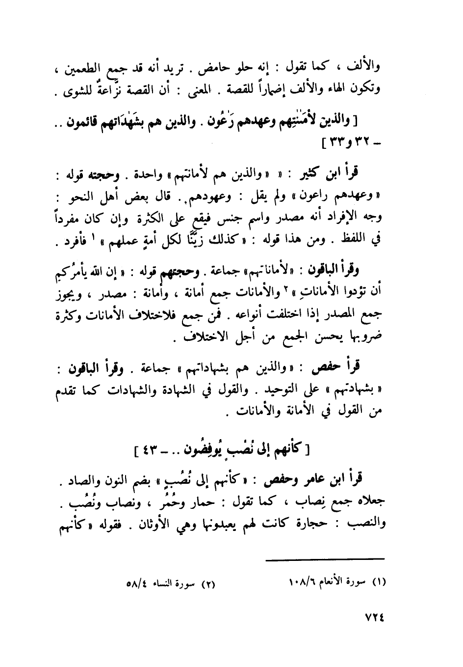 قَرَأَ ابْن كثير / وَالَّذين هم لأمانتهم / وَاحِدَة وحجته قَوْله {وَعَهْدهمْ رَاعُونَ} وَلم يقل وعهودهم قَالَ بعض أهل النَّحْو وَجه الْإِفْرَاد أَنه مصدر وَاسم جنس فَيَقَع على الْكَثْرَة وَإِن كَانَ مُفردا فِي اللَّفْظ وَمن هَذَا قَوْله {كَذَلِك زينا لكل أمة عَمَلهم} فأفرد