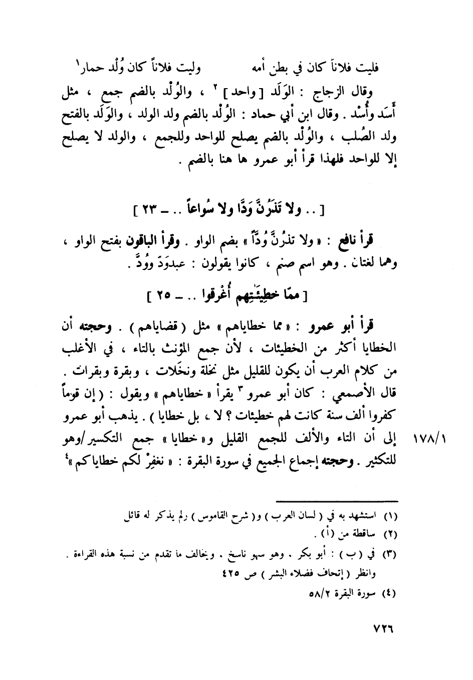 وَقَالَ الزّجاج الْوَلَد وَاحِد وَالْولد بِالضَّمِّ جمع مثل أَسد وَأسد وَقَالَ ابْن أبي حَمَّاد الْوَلَد بِالضَّمِّ ولد الْوَلَد وَالْولد بِالْفَتْح ولد الصلب وَالْولد بِالضَّمِّ يصلح للْوَاحِد وللجمع وَالْولد لَا يصلح إِلَّا للْوَاحِد فَلهَذَا قَرَأَ أَبُو عَمْرو هَا هُنَا بِالضَّمِّ {وَلَا تذرن ودا وَلَا سواعا}