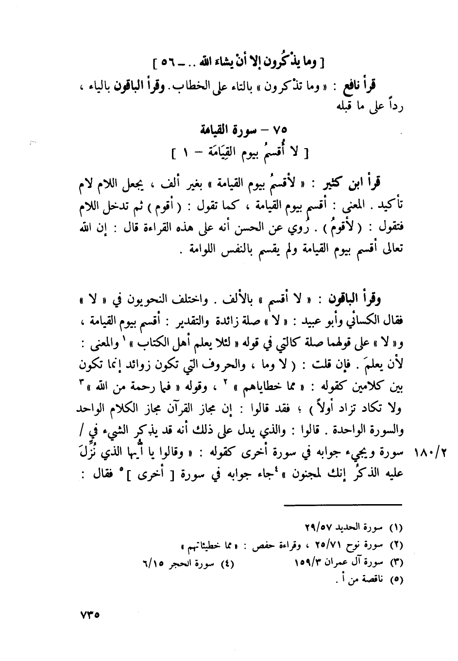 وَقَرَأَ الْبَاقُونَ لَا أقسم بِالْألف وَاخْتلف النَّحْوِيين فِي {لَا} فَقَالَ الْكسَائي وَأَبُو عبيد {لَا} صلَة زَائِدَة وَالتَّقْدِير أقسم بِيَوْم الْقِيَامَة و {لَا} على قَوْلهمَا صلَة كَالَّتِي فِي قَوْله {لِئَلَّا يعلم أهل الْكتاب} وَالْمعْنَى لِأَن يعلم فَإِن قلت لَا وَمَا والحروف الَّتِي تكون زَوَائِد إِنَّمَا تكون بَين كلامين كَقَوْلِه / مِمَّا خطاياهم / وَقَوله {فبمَا رَحْمَة من الله} وَلَا تكَاد تزاد أَولا فقد قَالُوا إِن مجَاز الْقُرْآن مجَاز الْكَلَام الْوَاحِد وَالسورَة الْوَاحِدَة قَالُوا وَالَّذِي يدل على ذَلِك أَنه قد يذكر الشَّيْء فِي سُورَة وَيَجِيء جَوَابه فِي سُورَة أُخْرَى كَقَوْلِه {وَقَالُوا يَا أَيهَا الَّذِي نزل عَلَيْهِ الذّكر إِنَّك لمَجْنُون} جَاءَ جَوَابه فِي سُورَة أُخْرَى فَقَالَ