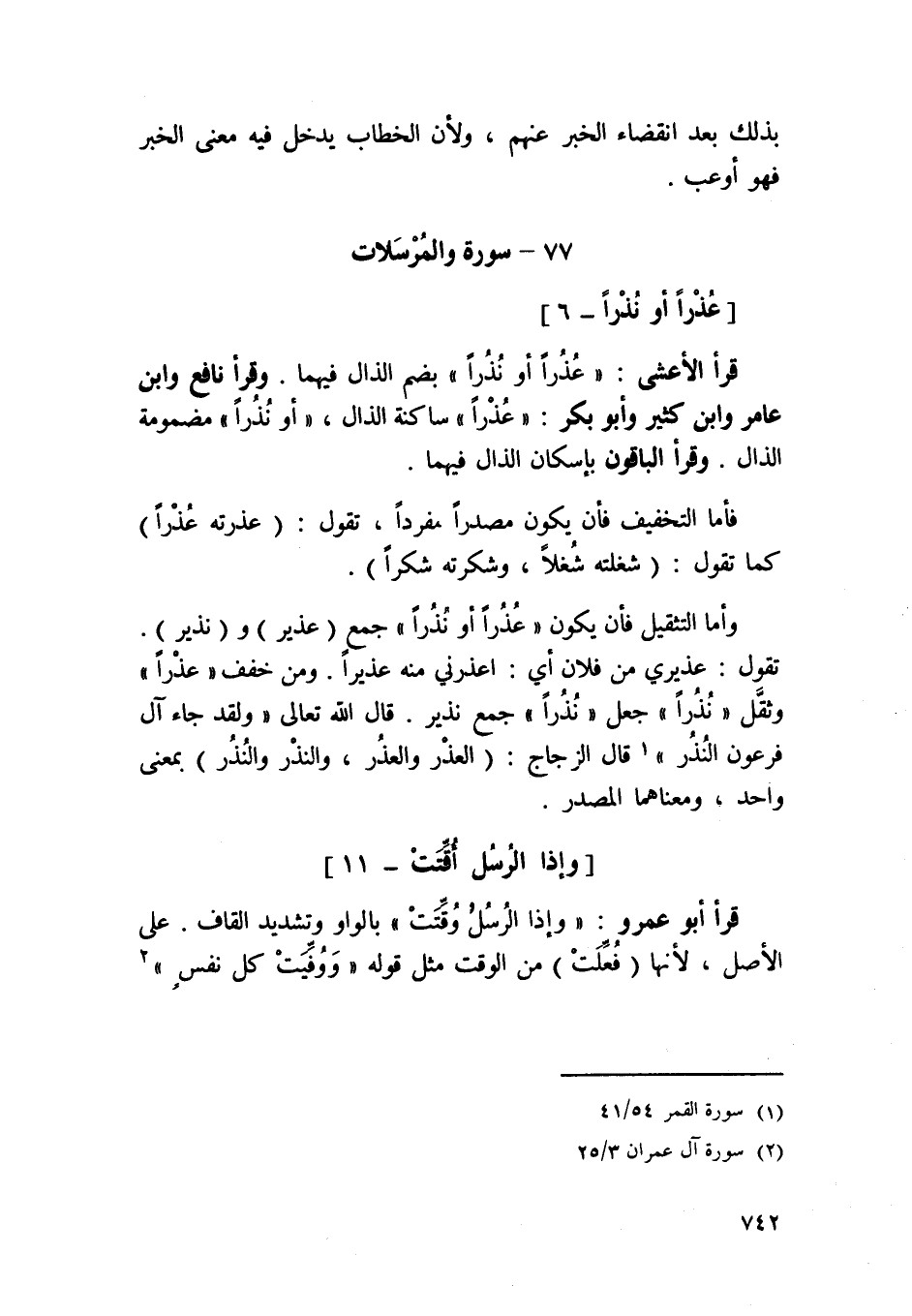 قَرَأَ الْأَعْشَى {عذرا أَو نذرا} بِضَم الذَّال فيهمَا وَقَرَأَ نَافِع وَابْن عَامر وَابْن كثير وَأَبُو بكر {عذرا} سَاكِنة الذَّال أَو {نذرا} مَضْمُومَة الذَّال وَقَرَأَ الْبَاقُونَ بِإِسْكَان الذَّال فيهمَا