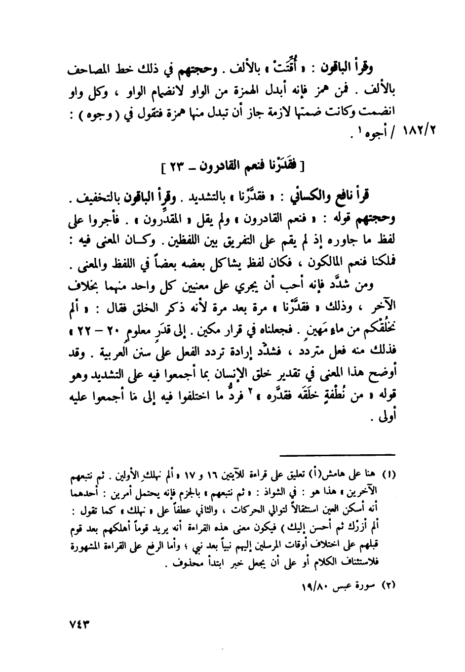 قَرَأَ نَافِع وَالْكسَائِيّ فقدرنا بِالتَّشْدِيدِ ورأ الْبَاقُونَ بِالتَّخْفِيفِ وحجتهم قَوْله {فَنعم القادرون} وَلم يقل المقدرون فأجروا على لفظ مَا جاوره إِذْ لم يقم على التَّفْرِيق بَين اللَّفْظَيْنِ وَكَانَ الْمَعْنى فِيهِ فملكنا فَنعم المالكون فَكَانَ لفظ يشاكل بعضه بَعْضًا فِي اللَّفْظ وَالْمعْنَى