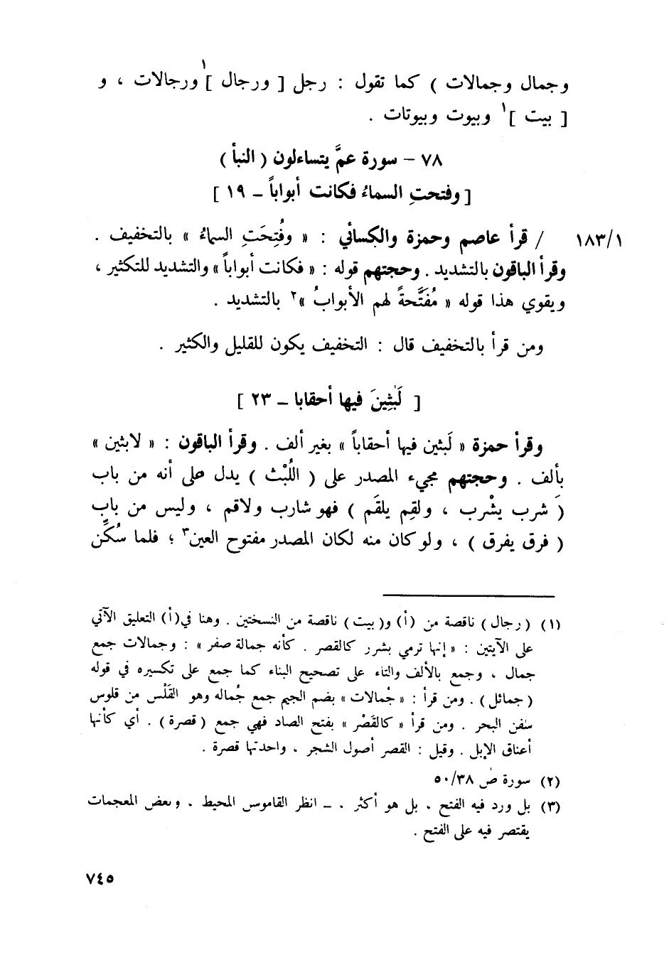 وَقَرَأَ حَمْزَة / لبثين فِيهَا أحقابا / بِغَيْر ألف وَقَرَأَ الْبَاقُونَ {لابثين} بِأَلف وحجتهم مَجِيء الْمصدر عَليّ اللّّبْث يدل على أَنه من بَاب شرب يشرب ولقم يلقم فَهُوَ شَارِب ولاقم وَلَيْسَ من بَاب فرق يفرق وَلَو كَانَ مِنْهُ لَكَانَ الْمصدر مَفْتُوح الْعين فَلَمَّا سكن