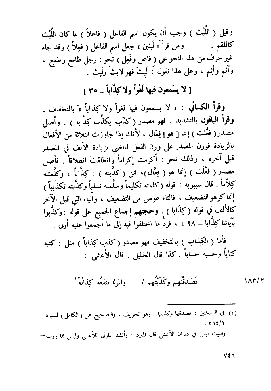 فَأَما الْكذَّاب بِالتَّخْفِيفِ فَهُوَ مصدر كذب كذابا مثل كتبه كتابا وحسبه حسابا كَذَا قَالَ الْخَلِيل قَالَ الْأَعْشَى ... فصدقتهم وكذبتهم ... ولمرء يَنْفَعهُ كذابه ...