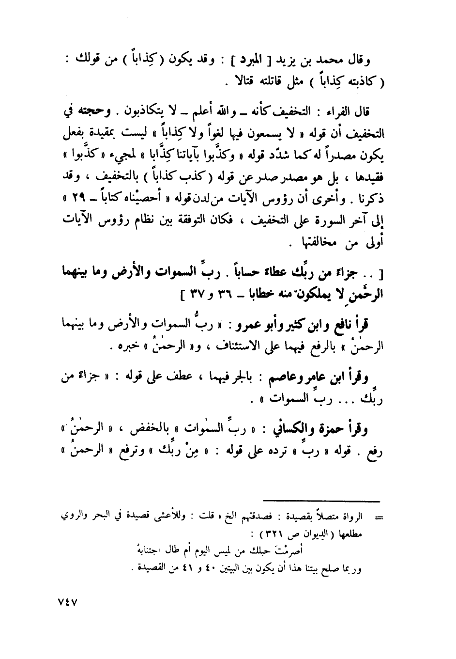 قَالَ الْفراء التَّخْفِيف كَأَنَّهُ وَالله أعلم لَا يتكاذبون وحجته فِي التَّخْفِيف أَن قَوْله لَا يسمعُونَ فِيهَا لَغوا وَلَا كذابا لَيست بمقيدة بِفعل يكون مصدرا لَهُ كَمَا شدد قَوْله {وكذبوا بِآيَاتِنَا كذابا} لمجيء {كذبُوا} فقيدها بل هُوَ مصدر صدر عَن قَوْله كذب كذابا بِالتَّخْفِيفِ وَقد ذكرنَا وَأُخْرَى أَن رُؤُوس الْآيَات من لدن قَوْله {أحصيناه كتابا} إِلَى أخر السُّورَة على التَّخْفِيف فَكَانَ التوفقة بَين نظام رُؤُوس الْآيَات أولى من مخالفتها {جَزَاء من رَبك عَطاء حسابا رب السَّمَاوَات وَالْأَرْض وَمَا بَينهمَا الرَّحْمَن لَا يملكُونَ مِنْهُ خطابا} 36 و 37