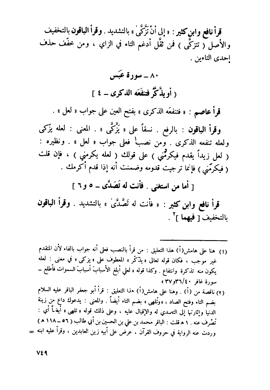 وَقَرَأَ الْبَاقُونَ بِالرَّفْع نسقا على {يُزكي} الْمَعْنى لَعَلَّه يزكّى وَلَعَلَّه تَنْفَعهُ الذكرى وَمن نصب فعلى جَوَاب {لَعَلَّ} وَنَظِيره لَعَلَّ زيدا يقدم فيكرمني على قَوْلك لَعَلَّه يكرمني فَإِن قلت فيكرمني فَإِنَّمَا ترجيت قدومه وضمنت أَنه إِذا قدم أكرمك {أما من اسْتغنى فَأَنت لَهُ تصدى} 5 و 6