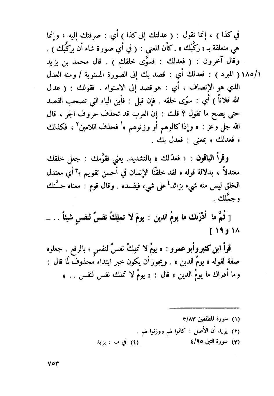 وقرا الْبَاقُونَ {فعدلك} التَّشْدِيد يَعْنِي فقومك جعل خلقك معتدلا بِدلَالَة قَوْله {لقد خلقنَا الْإِنْسَان فِي أحسن تَقْوِيم} أَي معتدل الْخلق لَيْسَ مِنْهُ شَيْء بزائد على شَيْء فيفسده وَقَالَ قوم مَعْنَاهُ حسنك وجملك {ثمَّ مَا أَدْرَاك مَا يَوْم الدّين يَوْم لَا تملك نفس لنَفس شَيْئا} 1918