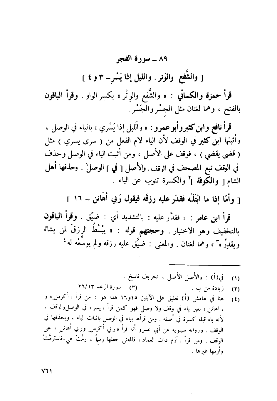 قَرَأَ نَافِع وَابْن كثير وَأَبُو عَمْرو / وَاللَّيْل إِذا يسري / بِالْيَاءِ فِي الْوَصْل وأثبتها ابْن كثير فِي الْوَقْف لِأَن الْيَاء لَام الْفِعْل من سرى يسري مثل قضى يقْضِي فَوقف على الأَصْل وَمن أثبت الْيَاء فِي الْوَصْل وَحذف فِي الْوَقْف تبع الْمُصحف فِي الْوَقْف وَالْأَصْل فِي الْوَصْل وحذفها أهل الشَّام والكوفة والكسرة تنوب عَن الْيَاء {وَأما إِذا مَا ابتلاه فَقدر عَلَيْهِ رزقه فَيَقُول رَبِّي أهانن} 16
