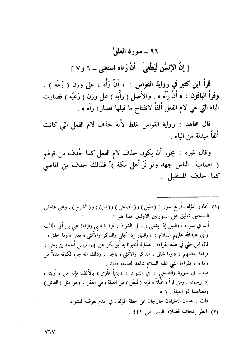 قَرَأَ ابْن كثير فِي رِوَايَة القواس {أَن رَآهُ} على وزن رعه وَقَرَأَ الْبَاقُونَ {أَن رَآهُ} وَالْأَصْل رَأْيه على وزن رعيه فَصَارَت الْيَاء الَّتِي هِيَ لَام الْفِعْل ألفا لانفتاح مَا قبلهَا فَصَارَ {رَآهُ}