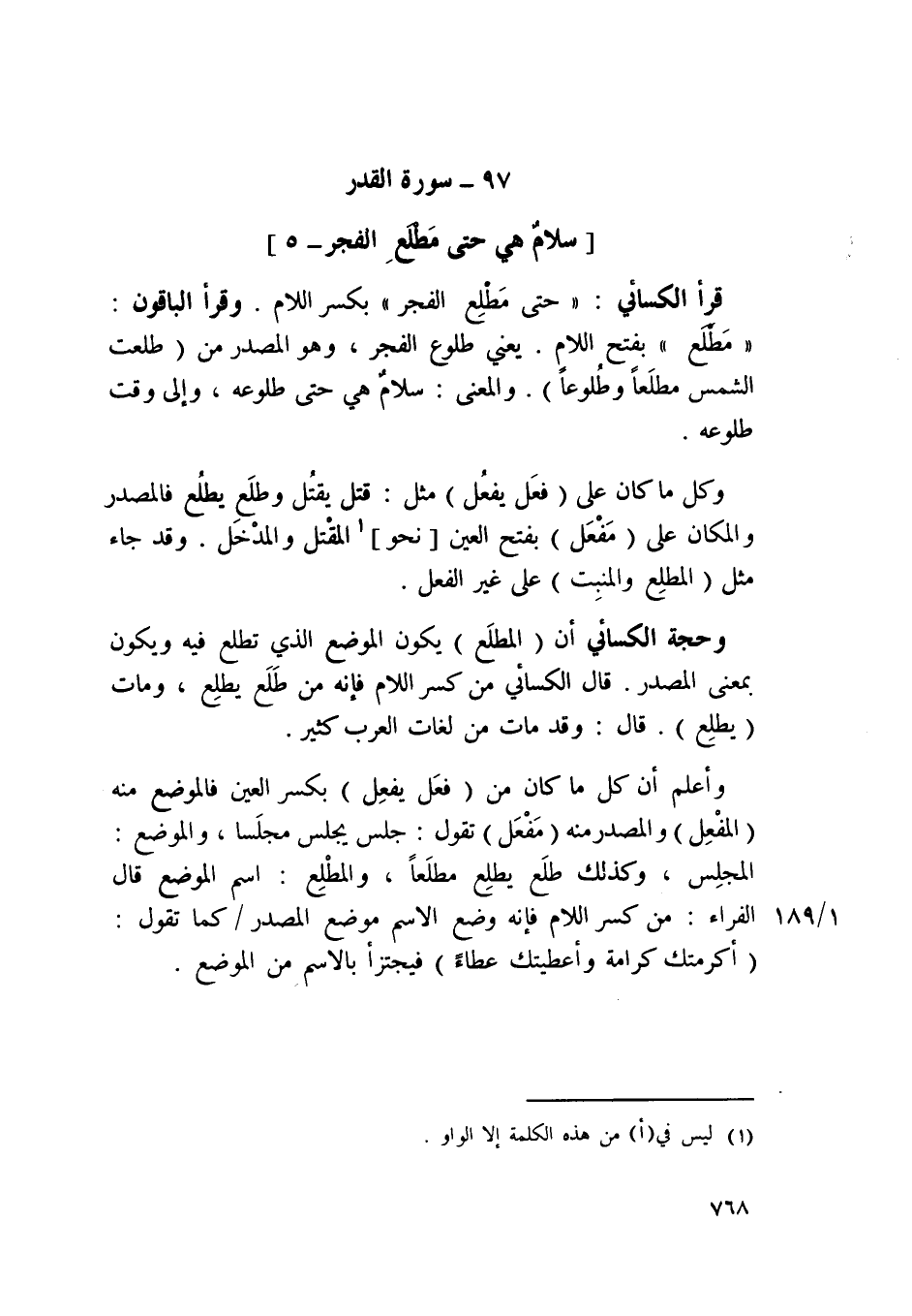 قَرَأَ الْكسَائي {حَتَّى مطلع الْفجْر} بِكَسْر اللَّام وَقَرَأَ الْبَاقُونَ {مطلع} بِفَتْح اللَّام يَعْنِي طُلُوع الْفجْر وَهُوَ الْمصدر من طلعت الشَّمْس مطلعا وطلوعا وَالْمعْنَى سَلام هِيَ حَتَّى طلوعه وَإِلَى وَقت طلوعه