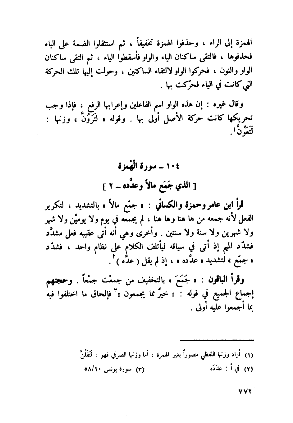 قَرَأَ ابْن عَامر وَحَمْزَة وَالْكسَائِيّ جمع مَالا بِالتَّشْدِيدِ لتكرير الْفِعْل لِأَنَّهُ جمعه من هَا هُنَا وَهَا هُنَا لم يجمعه فِي يَوْم وَلَا يَوْمَيْنِ وَلَا شهر وَلَا شَهْرَيْن وَلَا سنة وَلَا سنتَيْن وَأُخْرَى وَهِي أَنه أَتَى عَقِيبه فعل مشدد فَشدد الْمِيم إِذْ أَتَى فِي سِيَاقه ليأتلف الْكَلَام على نظام وَاحِد فَشدد {جمع} لتشديد {وعدده} إِذْ لم يقل عده