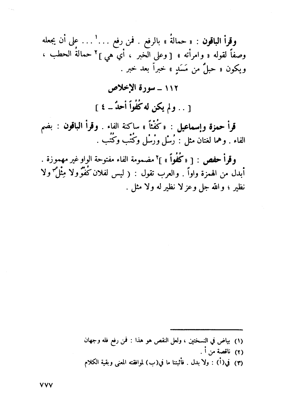 قَرَأَ حَمْزَة وَإِسْمَاعِيل / كفئا / سَاكِنة الْفَاء وَقَرَأَ الْبَاقُونَ بِضَم الْفَاء وهما لُغَتَانِ مثل رسل ورسل وَكتب وَكتب