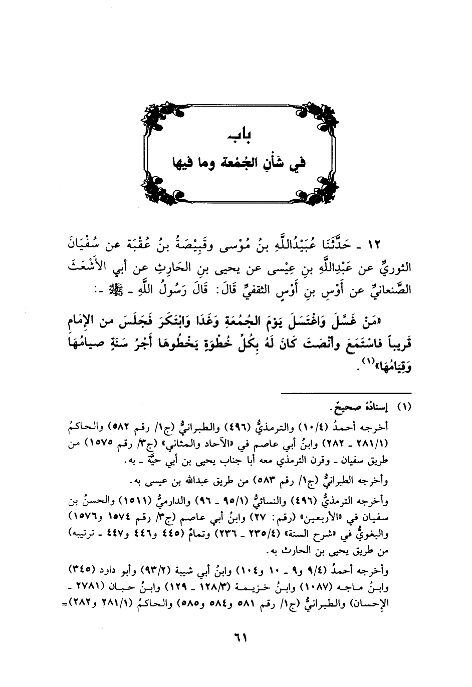 12 - حَدَّثَنَا عُبَيْدُ اللَّهِ بْنُ مُوسَى، وَقَبِيصَةُ بْنُ عُقْبَةَ، عَنْ سُفْيَانَ الثَّوْرِيِّ، عَنْ عَبْدِ اللَّهِ بْنِ عِيسَى، عَنْ يَحْيَى بْنِ الْحَارِثِ، عَنْ أَبِي الْأَشْعَثِ الصَّنْعَانِيِّ، عَنْ أَوْسِ بْنِ أَوْسٍ الثَّقَفِيِّ، قَالَ: قَالَ رَسُولُ اللَّهِ صَلَّى اللَّهُ عَلَيْهِ وَسَلَّمَ: «§مَنْ غَسَّلَ وَاغْتَسَلَ يَوْمَ الْجُمُعَةِ وَغَدَا وَابْتَكَرَ فَجَلَسَ مِنَ الْإِمَامِ قَرِيبًا فَاسْتَمَعَ وَأَنْصَتَ كَانَ لَهُ بِكُلِّ خُطْوَةٍ يَخْطُوهَا أَجْرُ سَنَةٍ صِيَامُهَا وَقِيَامُهَا»