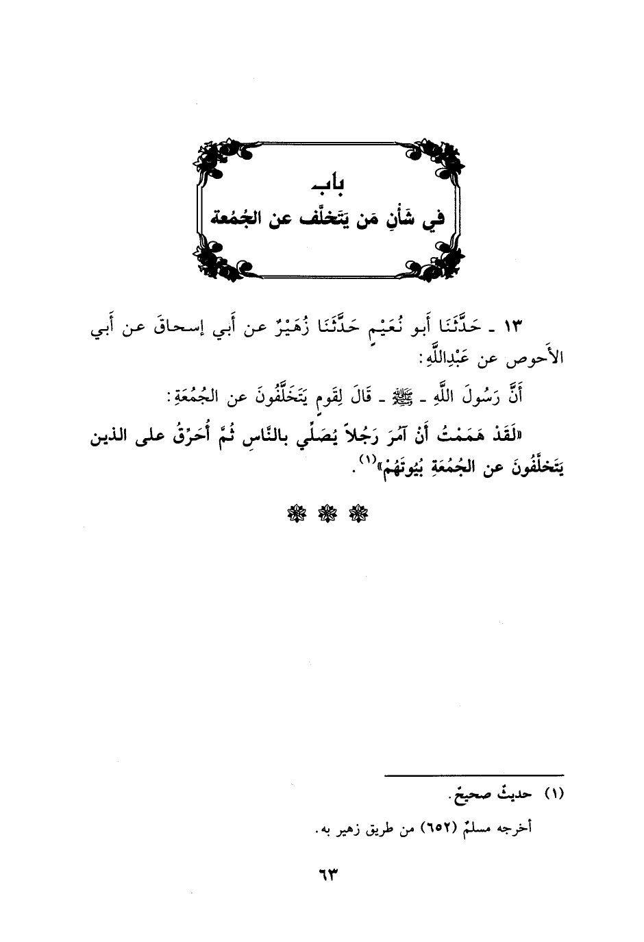 13 - حَدَّثَنَا أَبُو نُعَيْمٍ، حَدَّثَنَا زُهَيْرٌ، عَنْ أَبِي إِسْحَاقَ، عَنْ أَبِي الْأَحْوَصِ، عَنْ عَبْدِ اللَّهِ، أَنَّ رَسُولَ اللَّهِ صَلَّى اللَّهُ عَلَيْهِ وَسَلَّمَ قَالَ لِقَوْمٍ يَتَخَلَّفُونَ عَنِ الْجُمُعَةِ: «لَقَدْ §هَمَمْتُ أَنْ آمُرَ رَجُلًا يُصَلِّي بِالنَّاسِ ثُمَّ أُحَرِّقُ عَلَى الَّذِينَ يَتَخَلَّفُونَ عَنِ الْجُمُعَةِ بُيُوتَهُمْ»