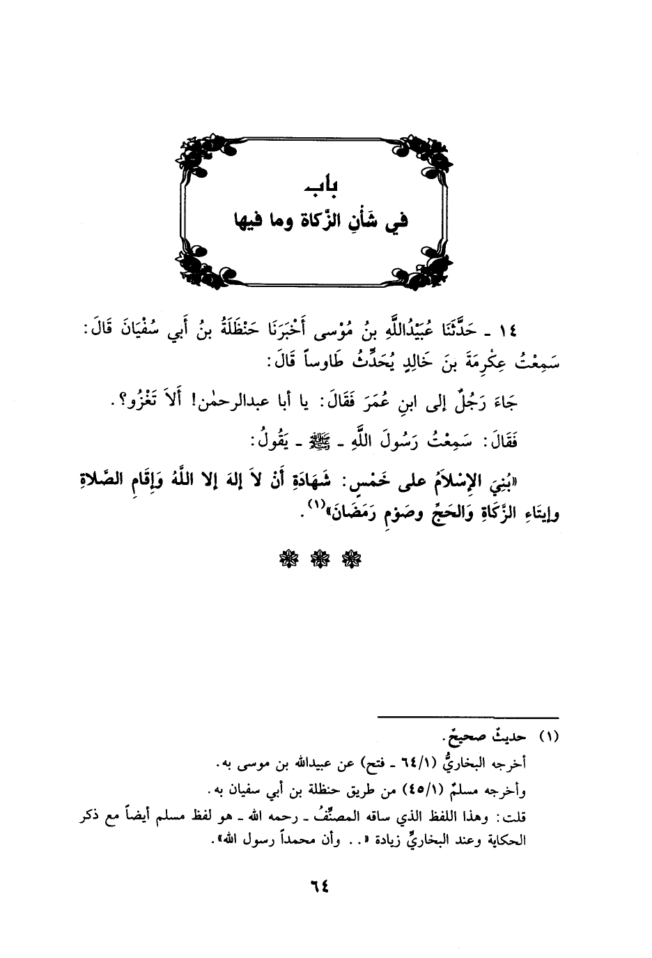14 - حَدَّثَنَا عُبَيْدُ اللَّهِ بْنُ مُوسَى، أَخْبَرَنَا حَنْظَلَةُ بْنُ أَبِي سُفْيَانَ، قَالَ: سَمِعْتُ عِكْرِمَةَ بْنَ خَالِدٍ، يُحَدِّثُ طَاوُسًا قَالَ: " جَاءَ رَجُلٌ إِلَى ابْنِ عُمَرَ فَقَالَ: يَا أَبَا عَبْدِ الرَّحْمَنِ أَلَا تَغْزُو؟ فقَالَ: سَمِعْتُ رَسُولَ اللَّهِ صَلَّى اللَّهُ عَلَيْهِ وَسَلَّمَ يَقُولُ: " §بُنِيَ الْإِسْلَامُ عَلَى خَمْسٍ: شَهَادَةِ أَنْ لَا إِلَهَ إِلَّا اللَّهُ، وَإِقَامِ الصَّلَاةِ، وَإِيتَاءِ الزَّكَاةِ، وَالْحَجِّ، وَصَوْمِ رَمَضَانَ "
