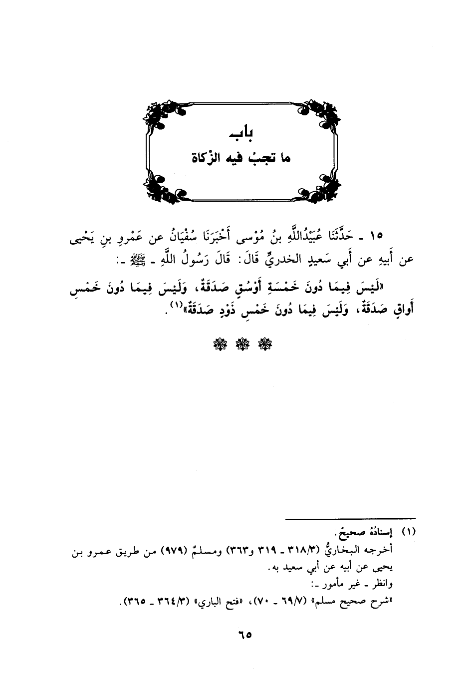 15 - حَدَّثَنَا عُبَيْدُ اللَّهِ بْنُ مُوسَى، أَخْبَرَنَا سُفْيَانُ، عَنْ عَمْرِو بْنِ يَحْيَى، عَنْ أَبِيهِ، عَنْ أَبِي سَعِيدٍ الْخُدْرِيِّ، قَالَ: قَالَ رَسُولُ اللَّهِ صَلَّى اللَّهُ عَلَيْهِ وَسَلَّمَ: «§لَيْسَ فِيمَا دُونَ خَمْسَةِ أَوْسُقٍ صَدَقَةٌ، وَلَيْسَ فِيمَا دُونَ خَمْسِ أَوَاقٍ صَدَقَةٌ، وَلَيْسَ فِيمَا دُونَ خَمْسِ ذَوْدٍ صَدَقَةٌ»