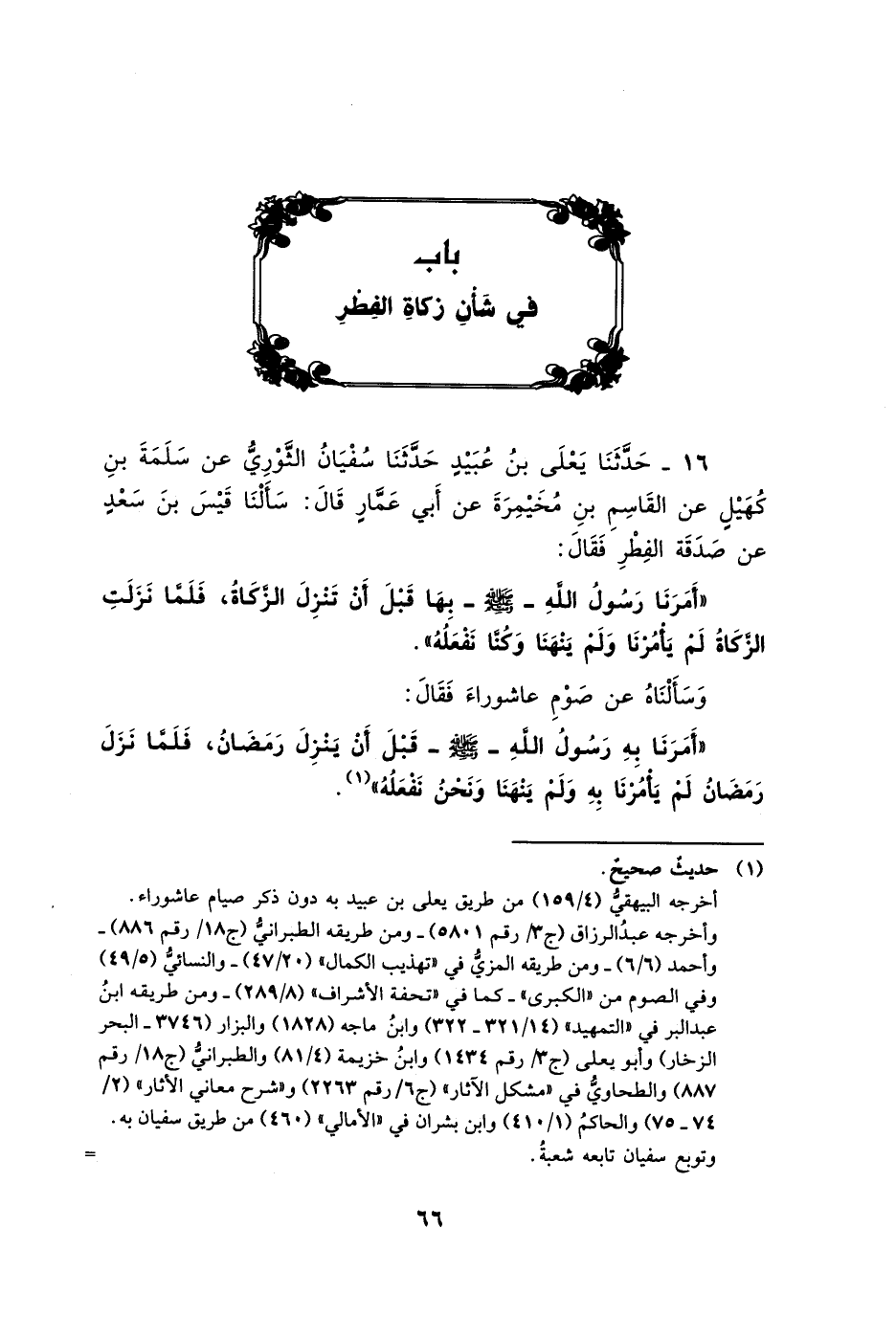 16 - حَدَّثَنَا يَعْلَى بْنُ عُبَيْدٍ، حَدَّثَنَا سُفْيَانُ الثَّوْرِيُّ، عَنْ سَلَمَةَ بْنِ كُهَيْلٍ، عَنِ الْقَاسِمِ بْنِ مُخَيْمِرَةَ، عَنْ أَبِي عَمَّارٍ، قَالَ: §سَأَلْنَا قَيْسَ بْنَ سَعْدٍ عَنْ صَدَقَةِ الْفِطْرِ، فَقَالَ: «أَمَرَنَا رَسُولُ اللَّهِ صَلَّى اللَّهُ عَلَيْهِ وَسَلَّمَ بِهَا قَبْلَ أَنْ تَنْزِلَ الزَّكَاةُ، فَلَمَّا نَزَلَتِ الزَّكَاةُ لَمْ يَأْمُرْنَا وَلَمْ يَنْهَنَا وَكُنَّا نَفْعَلُهُ»