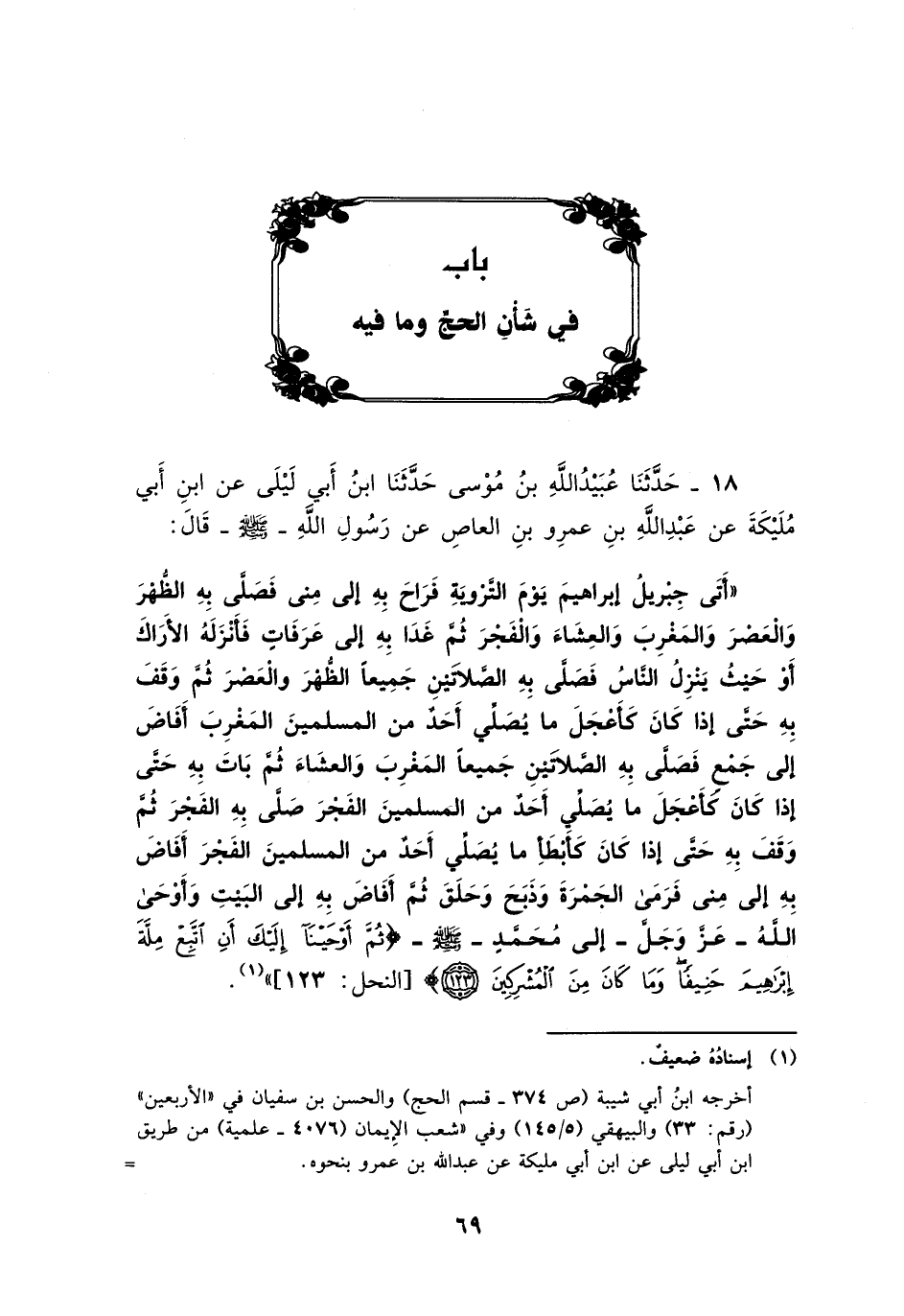 18 - حَدَّثَنَا عُبَيْدُ اللَّهِ بْنُ مُوسَى، حَدَّثَنَا ابْنُ أَبِي لَيْلَى، عَنِ ابْنِ أَبِي مُلَيْكَةَ، عَنْ عَبْدِ اللَّهِ بْنِ عَمْرِو بْنِ الْعَاصِ، عَنْ رَسُولِ اللَّهِ صَلَّى اللَّهُ عَلَيْهِ وَسَلَّمَ قَالَ: " §أَتَى جِبْرِيلُ إِبْرَاهِيمَ يَوْمَ التَّرْوِيَةِ فَرَاحَ بِهِ إِلَى مِنًى فَصَلَّى بِهِ الظُّهْرَ وَالْعَصْرَ وَالْمَغْرِبَ وَالْعِشَاءَ وَالْفَجْرَ ثُمَّ غَدَا بِهِ إِلَى عَرَفَاتٍ فَأَنْزَلَهُ الْأَرَاكَ أَوْ حَيْثُ يَنْزِلُ النَّاسُ فَصَلَّى بِهِ الصَّلَاتَيْنِ جَمِيعًا الظُّهْرَ وَالْعَصْرَ ثُمَّ وَقَفَ بِهِ حَتَّى إِذَا كَانَ كَأَعْجَلِ مَا يُصَلِّي أَحَدٌ مِنَ الْمُسْلِمِينَ الْمَغْرِبَ أَفَاضَ إِلَى جَمْعٍ فَصَلَّى بِهِ الصَّلَاتَيْنِ جَمِيعًا الْمَغْرِبَ وَالْعِشَاءَ ثُمَّ بَاتَ بِهِ حَتَّى إِذَا كَانَ كَأَعْجَلِ مَا يُصَلِّي أَحَدٌ مِنَ الْمُسْلِمِينَ الْفَجْرَ صَلَّى بِهِ الْفَجْرَ ثُمَّ وَقَفَ بِهِ حَتَّى إِذَا كَانَ كَأَبْطَأِ مَا يُصَلِّي أَحَدٌ مِنَ الْمُسْلِمِينَ الْفَجْرَ أَفَاضَ بِهِ إِلَى مِنًى فَرَمَى الْجَمْرَةَ وَذَبَحَ وَحَلَقَ ثُمَّ أَفَاضَ بِهِ إِلَى الْبَيْتِ وَأَوْحَى اللَّهُ عَزَّ وَجَلَّ إِلَى مُحَمَّدٍ صَلَّى اللَّهُ عَلَيْهِ وَسَلَّمَ: {ثُمَّ أَوْحَيْنَا إِلَيْكَ أَنِ اتَّبِعْ مِلَّةَ إِبْرَاهِيمَ حَنِيفًا وَمَا كَانَ مِنَ الْمُشْرِكِينَ} [النحل: 123] "