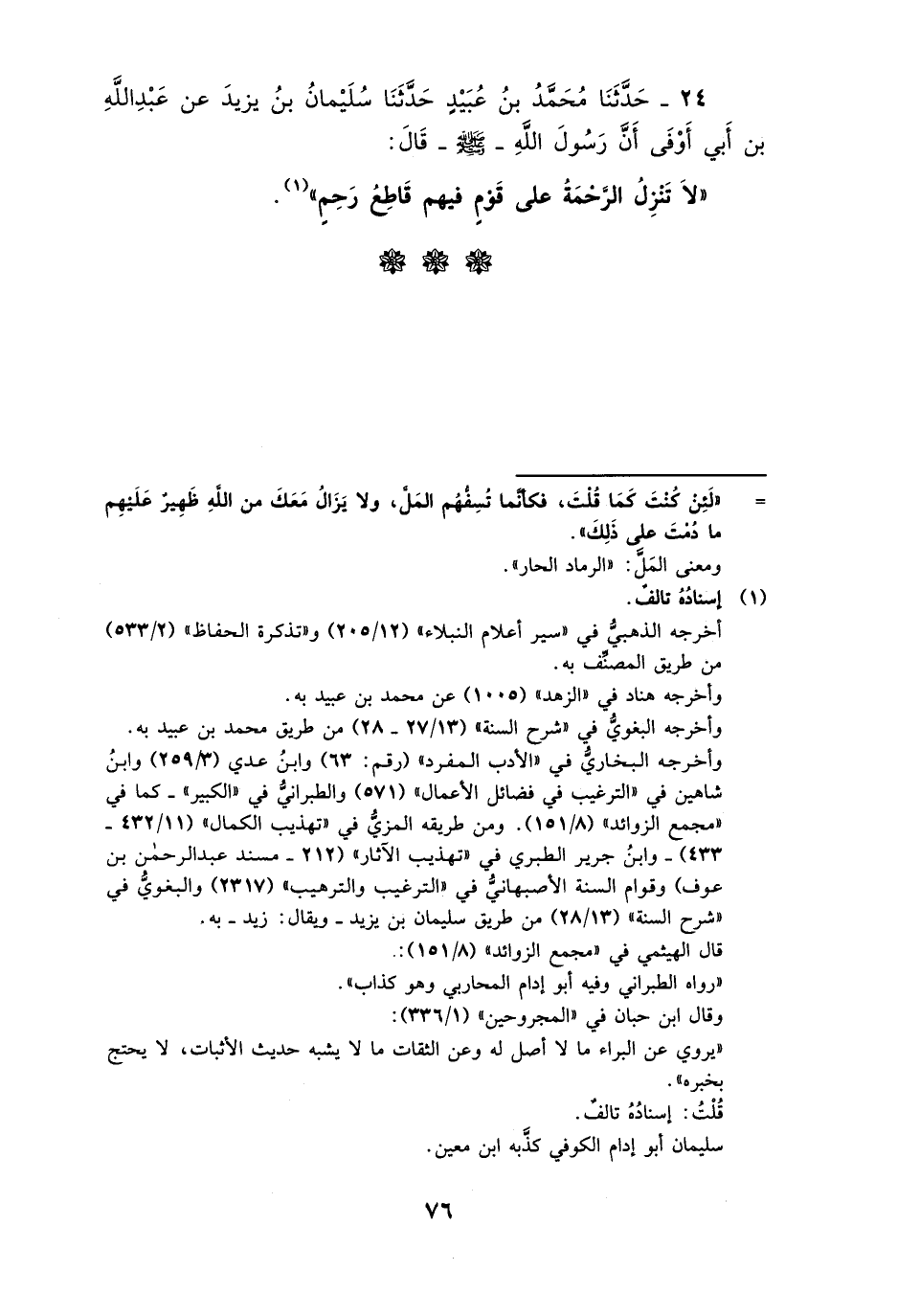 24 - حَدَّثَنَا مُحَمَّدُ بْنُ عُبَيْدٍ، حَدَّثَنَا سُلَيْمَانُ بْنُ يَزِيدَ، عَنْ عَبْدِ اللَّهِ بْنِ أَبِي أَوْفَى، أَنَّ رَسُولَ اللَّهِ صَلَّى اللَّهُ عَلَيْهِ وَسَلَّمَ، قَالَ: «§لَا تَنْزِلُ الرَّحْمَةُ عَلَى قَوْمٍ فِيهِمْ قَاطِعُ رَحِمٍ»