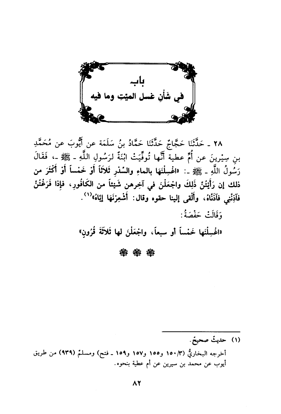 28 - حَدَّثَنَا حَجَّاجٌ، حَدَّثَنَا حَمَّادُ بْنُ سَلَمَةَ، عَنْ أَيُّوبَ، عَنْ مُحَمَّدِ بْنِ سِيرِينَ، عَنْ أُمِّ عَطِيَّةَ، أَنَّهَا تُوُفِّيَتِ ابْنَةٌ لِرَسُولِ اللَّهِ صَلَّى اللَّهُ عَلَيْهِ وَسَلَّمَ، فَقَالَ رَسُولُ اللَّهِ صَلَّى اللَّهُ عَلَيْهِ وَسَلَّمَ: «§اغْسِلْنَهَا بِالْمَاءِ وَالسِّدْرِ ثَلَاثًا أَوْ خَمْسًا أَوْ أَكْثَرَ مِنْ ذَلِكَ إِنْ رَأَيْتُنَّ ذَلِكَ وَاجْعَلْنَ فِي آخِرِهِنَّ شَيْئًا مِنَ الْكَافُورِ، فَإِذَا فَرَغْتُنَّ فَآذِنَّنِي» فَآذَنَّاهُ، وَأَلْقَى إِلَيْنَا حَقْوَهُ، وَقَالَ: «أَشْعِرْنَهَا إِيَّاهُ» وَقَالَتْ حَفْصَةُ: «اغْسِلْنَهَا خَمْسًا أَوْ سَبْعًا، وَاجْعَلْنَ لَهَا ثَلَاثَةَ قُرُونٍ»