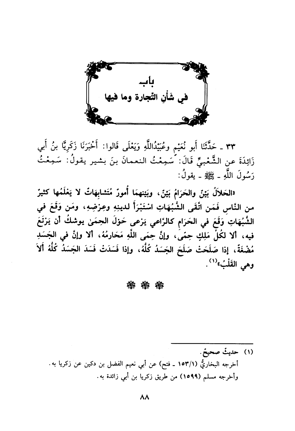 33 - حَدَّثَنَا أَبُو نُعَيْمٍ، وَعُبَيْدُ اللَّهِ، وَيَعْلَى، قَالُوا: أَخْبَرَنَا زَكَرِيَّا بْنُ أَبِي زَائِدَةَ، عَنِ الشَّعْبِيِّ، قَالَ: سَمِعْتُ النُّعْمَانَ بْنَ بَشِيرٍ، يَقُولُ: سَمِعْتُ رَسُولَ اللَّهِ صَلَّى اللَّهُ عَلَيْهِ وَسَلَّمَ يَقُولُ: «§الْحَلَالُ بَيِّنٌ وَالْحَرَامُ بَيِّنٌ، وَبَيْنَهُمَا أُمُورٌ مُتَشَابِهَاتٌ لَا يَعْلَمُهَا كَثِيرٌ مِنَ النَّاسِ فَمَنِ اتَّقَى الشُّبُهَاتِ اسْتَبْرَأَ لِدِينِهِ وَعِرْضِهِ، وَمَنْ وَقَعَ فِي الشُّبُهَاتِ وَقَعَ فِي الْحَرَامِ، كَالرَّاعِي يَرْعَى حَوْلَ الْحِمَى يُوشِكُ أَنْ يَرْتَعَ فِيهِ، أَلَا لِكُلِّ مَلِكٍ حِمًى، وَإِنَّ حِمَى اللَّهِ مَحَارِمُهُ، أَلَا وَإِنَّ فِي الْجَسَدِ مُضْغَةً، إِذَا صَلَحَتْ صَلَحَ الْجَسَدُ كُلُّهُ، وَإِذَا فَسَدَتْ فَسَدَ الْجَسَدُ كُلُّهُ، أَلَا وَهِيَ الْقَلْبُ»