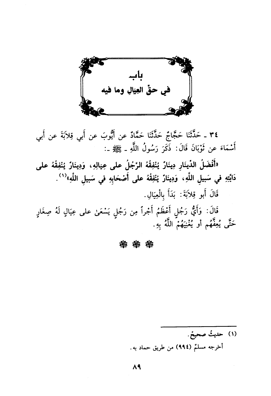 34 - حَدَّثَنَا حَجَّاجٌ، حَدَّثَنَا حَمَّادٌ، عَنْ أَيُّوبَ، عَنْ أَبِي قِلَابَةَ، عَنْ أَبِي أَسْمَاءَ، عَنْ ثَوْبَانَ، قَالَ: ذَكَرَ رَسُولُ اللَّهِ صَلَّى اللَّهُ عَلَيْهِ وَسَلَّمَ: «§أَفْضَلُ الدِّينَارِ دِينَارٌ يُنْفِقُهُ الرَّجُلُ عَلَى عِيَالِهِ، وَدِينَارٌ يُنْفِقُهُ عَلَى دَابَّتِهِ فِي سَبِيلِ اللَّهِ، وَدِينَارٌ يُنْفِقُهُ عَلَى أَصْحَابِهِ فِي سَبِيلِ اللَّهِ» قَالَ أَبُو قِلَابَةَ: بَدَأَ بِالْعِيَالِ قَالَ: وَأَيُّ رَجُلٍ أَعْظَمُ أَجْرًا مِنْ رَجُلٍ يَسْعَى عَلَى عِيَالٍ لَهُ صِغَارٍ حَتَّى يُعِفَّهُمْ أَوْ يُغْنِيَهُمُ اللَّهُ بِهِ