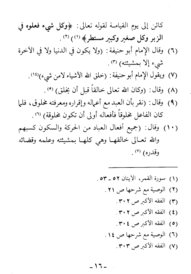6 - وقال الإمام أبو حنيفة: «ولا يكون في الدنيا ولا في الآخرة شيء إلا بمشيئته» (¬2).
