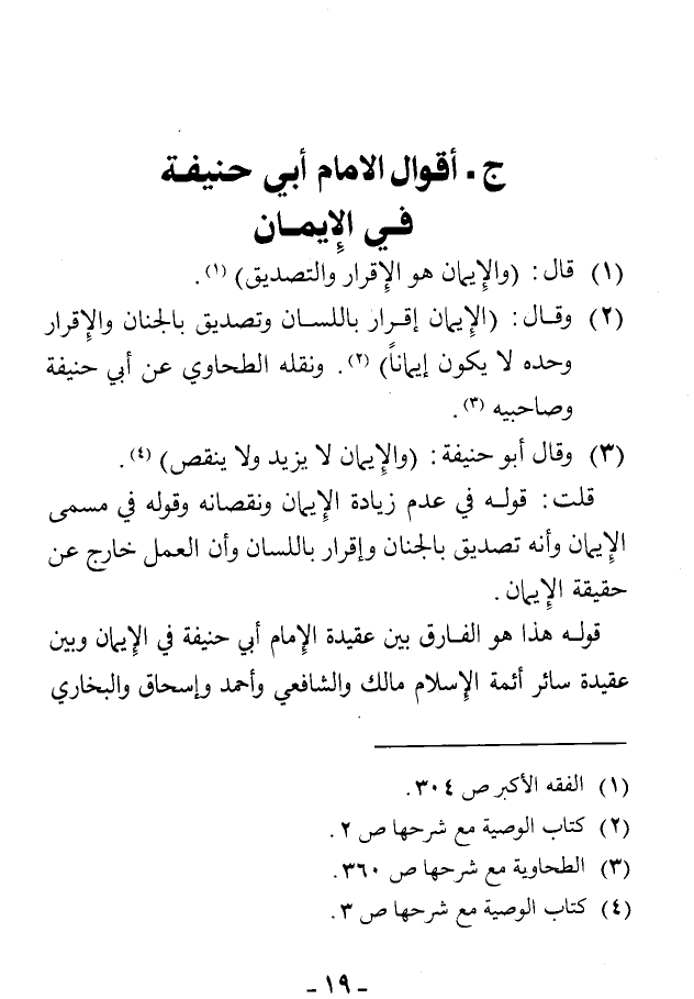 3 - وقال أبو حنيفة: «والإيمان لا يزيد ولا ينقص» (¬4).