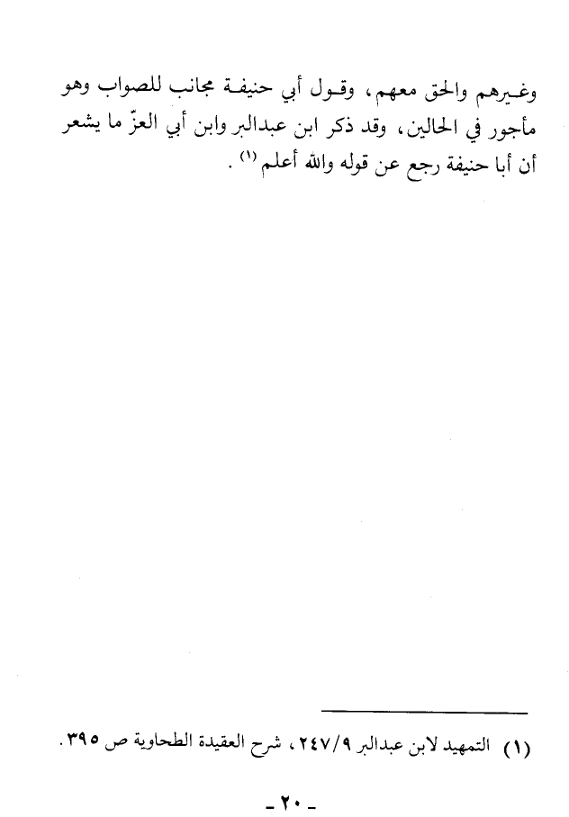 وقول أبي حنيفة مجانب للصواب وهو مأجور في الحالين، وقد ذكر ابن عبد البر وابن أبي العزّ ما يشعر أن أبا حنيفة رجع عن قوله والله أعلم (¬1).