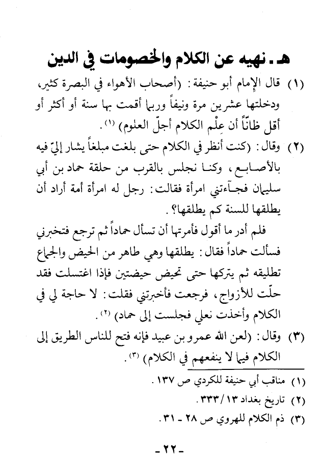 1 - قال الإمام أبو حنيفة: «أصحاب الأهواء في البصرة كثير، ودخلتها عشرين مرة ونيفًا وربما أقمت بها سنة أو أكثر أو أقل ظانًّا أن علم الكلام أجل العلوم» (¬1).