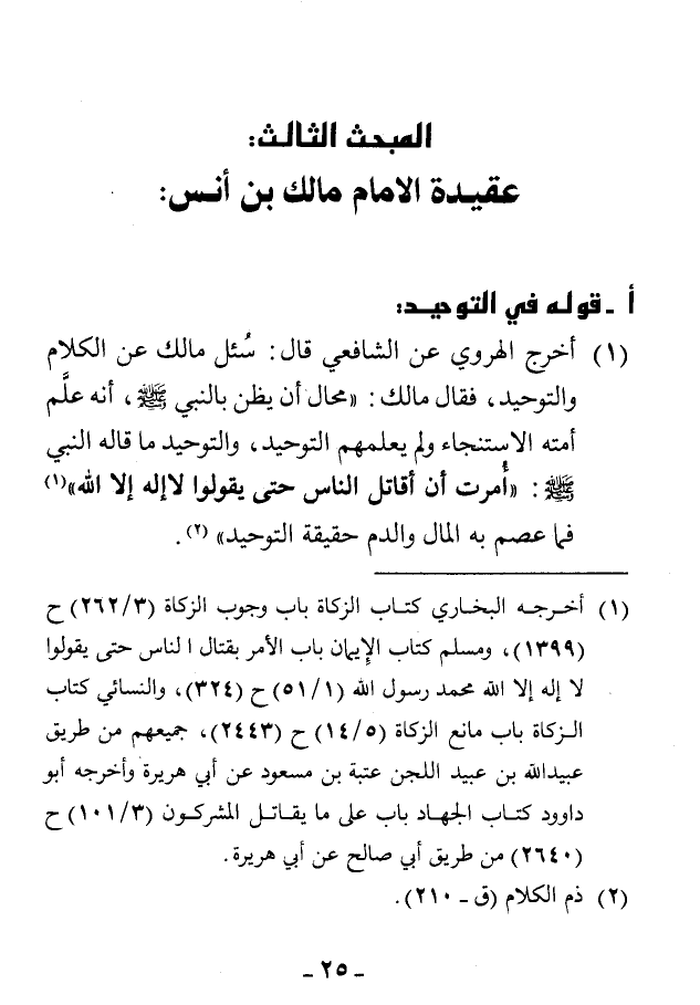 1 - أخرج الهروي عن الشافعي قال: سُئل مالك عن الكلام والتوحيد، فقال مالك: «محال أن يظن بالنبي - صَلَّى اللهُ عَلَيْهِ وَسَلَّمَ -، أنه علَّم أمته الاستنجاء ولم يعلمهم التوحيد، والتوحيد ما قاله النبي - صَلَّى اللهُ عَلَيْهِ وَسَلَّمَ -: «أُمرت أن أقاتل الناس حتى يقولوا لا إله إلا الله» (¬1) فما عصم به المال والدم حقيقة التوحيد» (¬2).