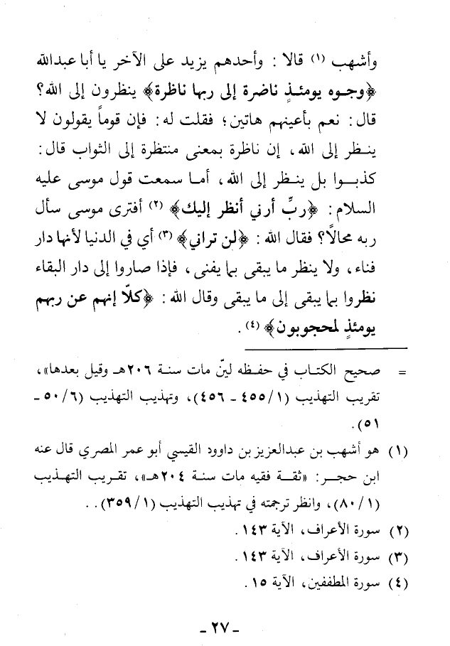 وأشهب (¬1) قالا: وأحدهم يزيد على الآخر يا أبا عبد الله: {وُجُوهٌ يَوْمَئِذٍ نَاضِرَةٌ * إِلَى رَبِّهَا نَاظِرَةٌ} ينظرون إلى الله؟ قال: نعم بأعينهم هاتين؛ فقلت له: فإن قومًا يقولون لا ينظر إلى الله، إن ناظرة بمعنى منتظرة إلى الثواب قال: كذبوا بل ينظر إلى الله، أما سمعت قول موسى عليه السلام: {رَبِّ أَرِنِي أَنْظُرْ إِلَيْكَ} [الأعراف: 143]، أفترى موسى سأله ربه محالاً؟ فقال الله: {لَنْ تَرَانِي} [الأعراف: 143] أي في الدنيا لأنها دار فناء، ولا ينظر ما يبقى بما يفنى، فإذا صاروا إلى دار البقاء نظروا بما يبقى إلى ما يبقى وقال الله: {كَلَّا إِنَّهُمْ عَنْ رَبِّهِمْ يَوْمَئِذٍ لَمَحْجُوبُونَ} [المطففين: 15].