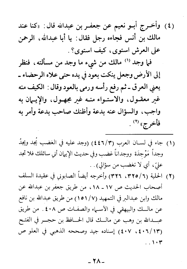 4 - وأخرج أبو نعيم عن جعفر بن عبد الله قال: «كنا عند مالك بن أنس فجاءه رجل فقال: يا أبا عبد الله، الرحمن على العرش استوى، كيف استوى؟.