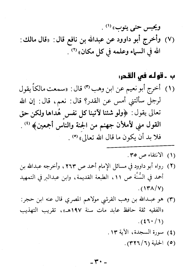 1 - أخرج أبو نعيم عن ابن وهب (¬3) قال: «سمعت مالكًا يقول لرجل: سألتني أمس عن القدر؟ قال: نعم، قال: إن الله تعالى يقول: {وَلَوْ شِئْنَا لَآَتَيْنَا كُلَّ نَفْسٍ هُدَاهَا وَلَكِنْ حَقَّ الْقَوْلُ مِنِّي لَأَمْلَأَنَّ جَهَنَّمَ مِنَ الْجِنَّةِ وَالنَّاسِ أَجْمَعِينَ} [السجدة: 13].