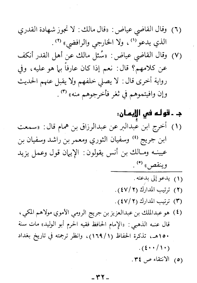 7 - وقال القاضي عياض: «سُئل مالك عن أهل القدر أنكف عن كلامهم؟ قال: نعم إذا كان عارفًا بما هو عليه، وفي رواية أخرى قال: لا يصلي خلفهم ولا يقبل عنهم الحديث وإن وافيتموهم في ثغر فأخرجوهم منه» (¬3).