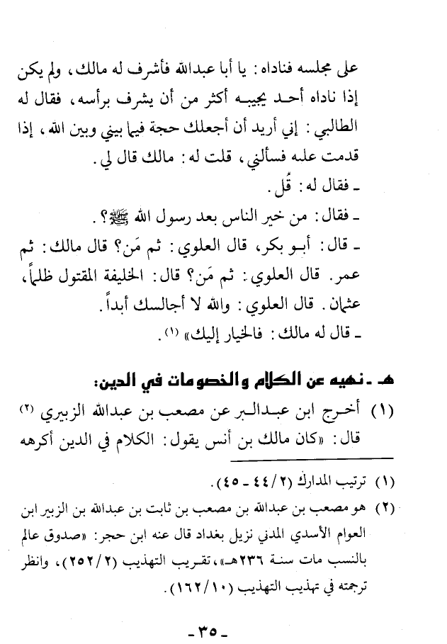 1 - أخرج ابن عبد البر عن مصعب بن عبد الله الزبيري (¬2) قال: «كان مالك بن أنس يقول: الكلام في الدين أكرهه