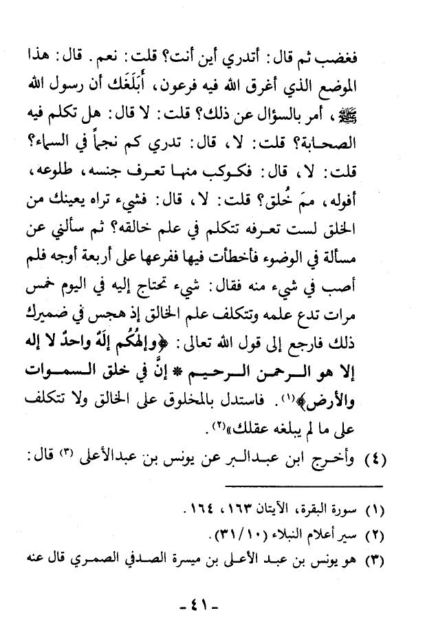 فغضب ثم قال: أتدري أين أنت؟ قلت: نعم. قال: هذا الموضع الذي أغرق الله فيه فرعون، أبلغك أن رسول الله - صَلَّى اللهُ عَلَيْهِ وَسَلَّمَ -، أمر بالسؤال عن ذلك؟ قلت: لا. قال: هل تكلم فيه الصحابة؟ قلت: لا، قال: تدري كم نجمًا في السماء؟ قلت: لا، قال: فكوكب منها تعرف جنسه، طلوعه، أفوله، مم خُلق؟ قلت: لا، قال: فشيء تراه يعينك من الخلق لست تعرفه تتكلم في علم خالقه؟