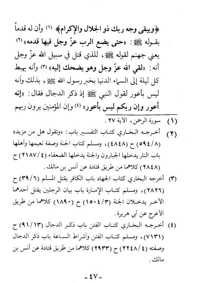 {وَيَبْقَى وَجْهُ رَبِّكَ ذُو الْجَلَالِ وَالْإِكْرَامِ} [الرحمن: 27]، وأن له قدمًا بقوله - صَلَّى اللهُ عَلَيْهِ وَسَلَّمَ -: «حتى يضع الرب عز وجل فيها قدمه» (¬1) يعني جهنم لقوله - صَلَّى اللهُ عَلَيْهِ وَسَلَّمَ -، للذي قتل في سبيل الله عز وجل أنه: «لقي الله عز وجل وهو يضحك إليه» (¬2) وأنه يهبط كل ليلة إلى السماء الدنيا بخبر رسول الله - صَلَّى اللهُ عَلَيْهِ وَسَلَّمَ -، بذلك وأنه ليس بأعور لقول النبي - صَلَّى اللهُ عَلَيْهِ وَسَلَّمَ - إذ ذكر الدجال فقال: «إنه أعور وإن ربكم ليس بأعور» (¬3).